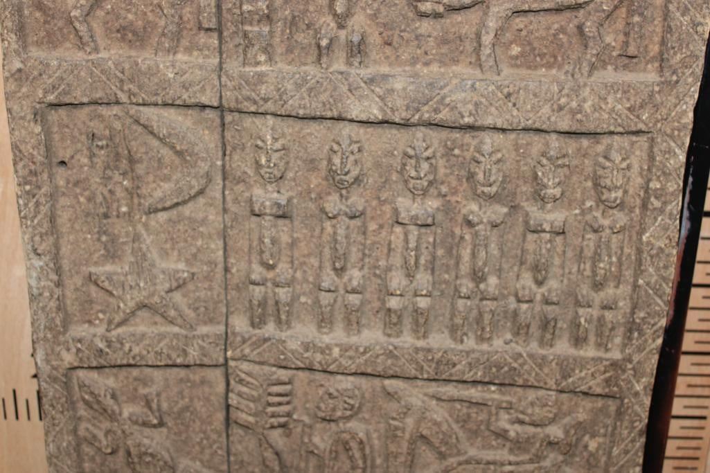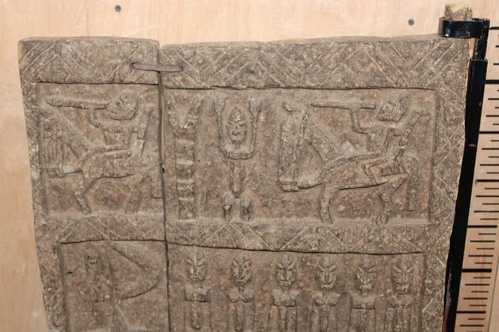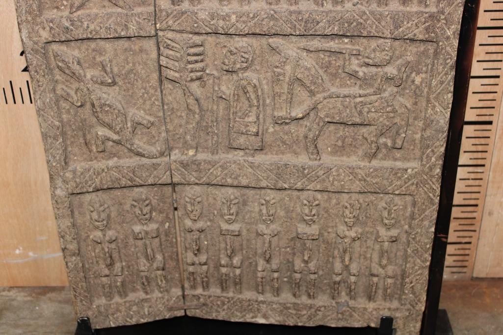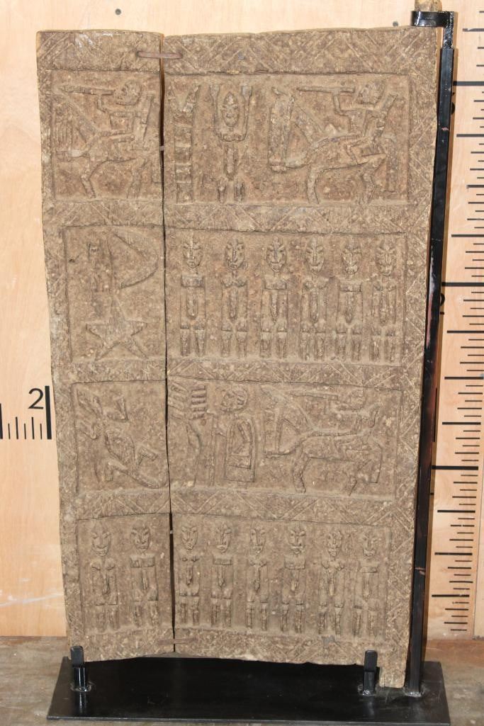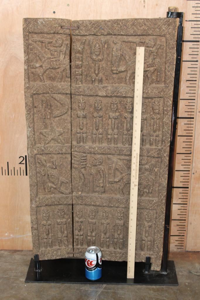 Antique African Dogon Granary DOOR on a Custom Metal Stand. This is Hand-carved Wood from Mali, West Africa. It measures 42" Tall x 24" Long x 7" Wide and Weighs 35 lbs. These were traditionally used for covering the entry to family grain storage structures. There are high-relief carvings of ancestors to protect the harvest and it depicts cosmological symbols or family lineage. The intricate designs often reflect the owner's status within Dogon Society. ANTIQUE AFRICAN ARTIFACTS