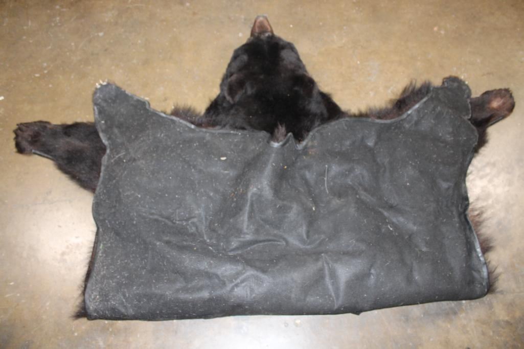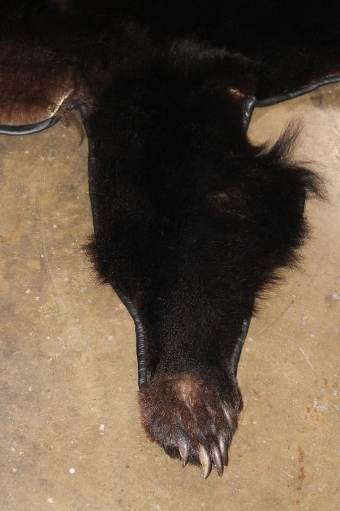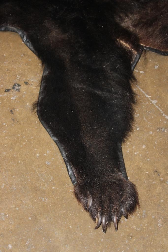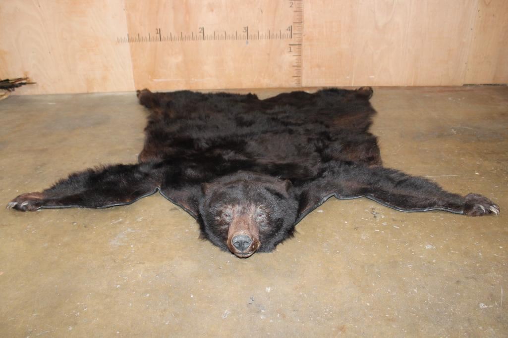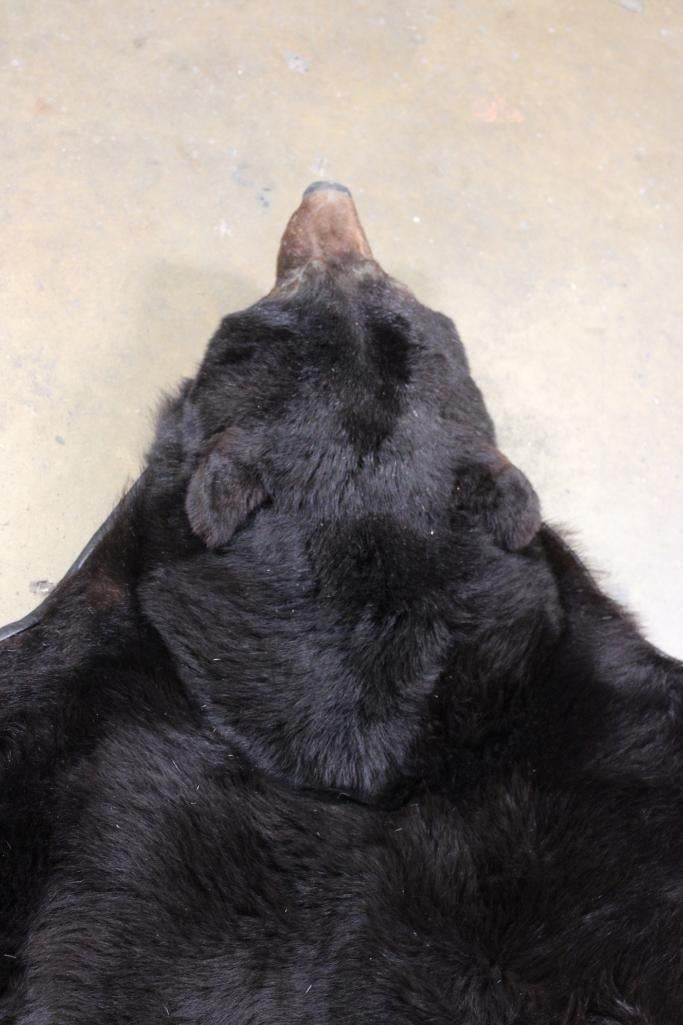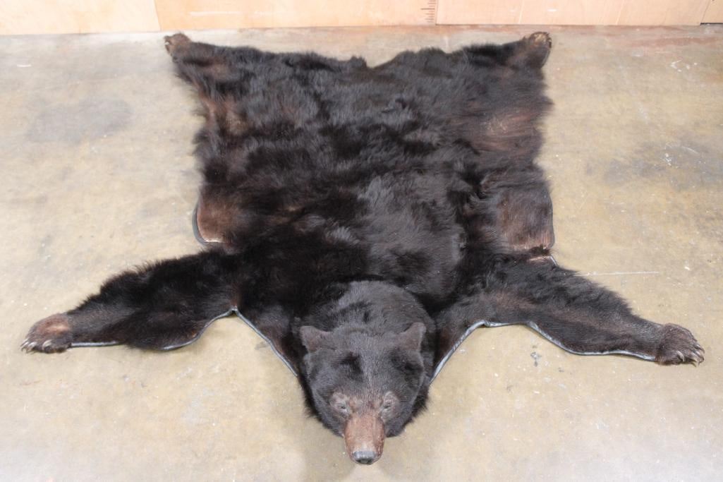 Very Nice and Newer BLACK BEAR Hide or BLACK BEAR Rug. It has its Mounted Head, Paws and All Claws. It measures 78" Long x 74" Wide and has Carpet Backing and Leather Piping. It is in Very Good Condition. TAXIDERMY RUGS