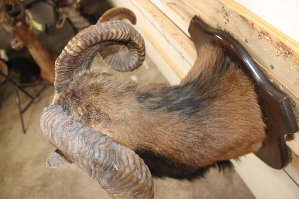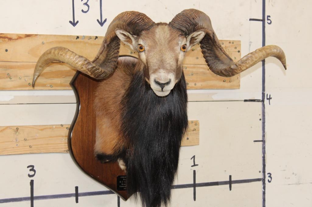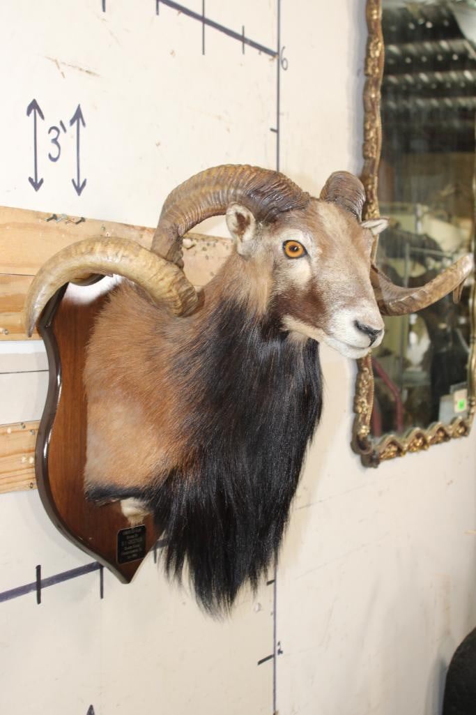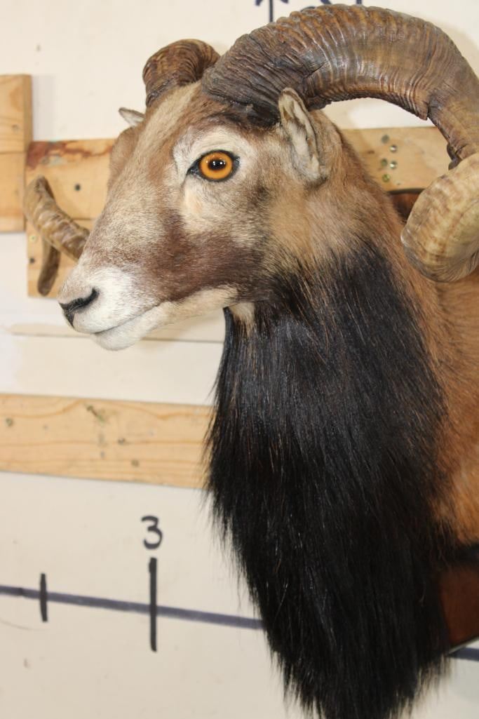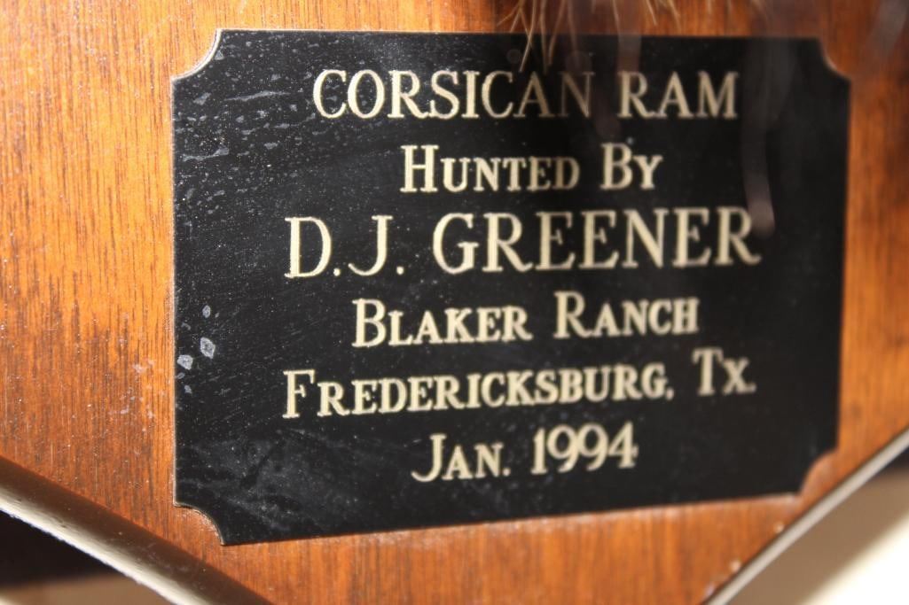 Very Nice CORSICAN SHEEP RAM Shoulder Mount on a Wooden Plaque. It was hunted on Blaker Ranch in Fredericksburg, Texas and was Taken in January 1994. The Left Horn measures 31 1/8" Long and 8.5" around the Horn Base. The Right Horn measures 31.75" Long and 8 3/8" around the Horn Base. It has a 30.5" Spread and is in Very Good Condition for its age. TAXIDERMY
