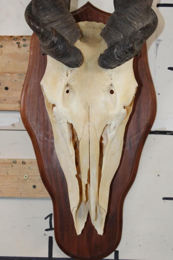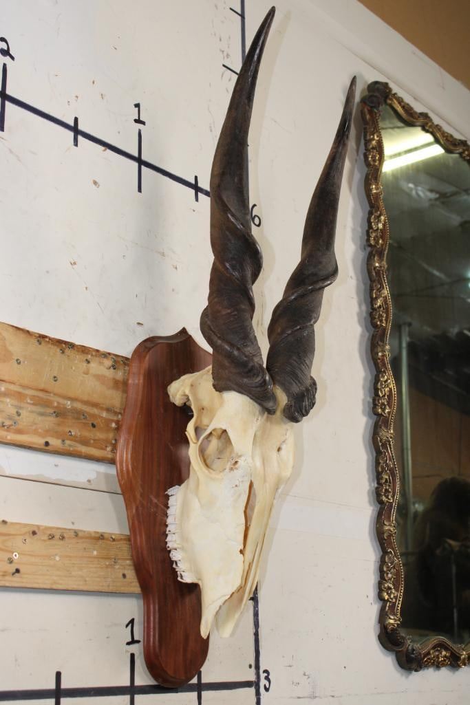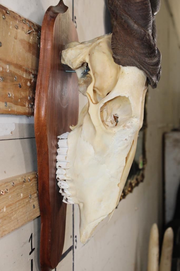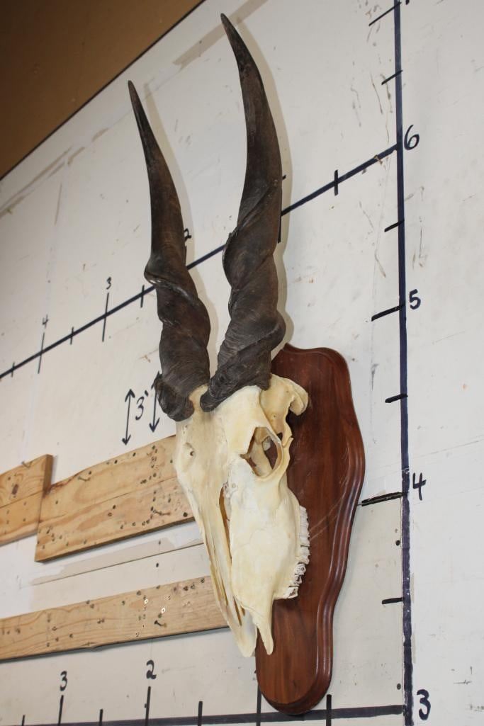 Big ELAND Skull on a Wooden Plaque. The Right Horn measures 33.5" around the spiral ridge and the Left Horn measures 32.5" around the spiral ridge. It was Taken in Zambia 2004. TAXIDERMY
