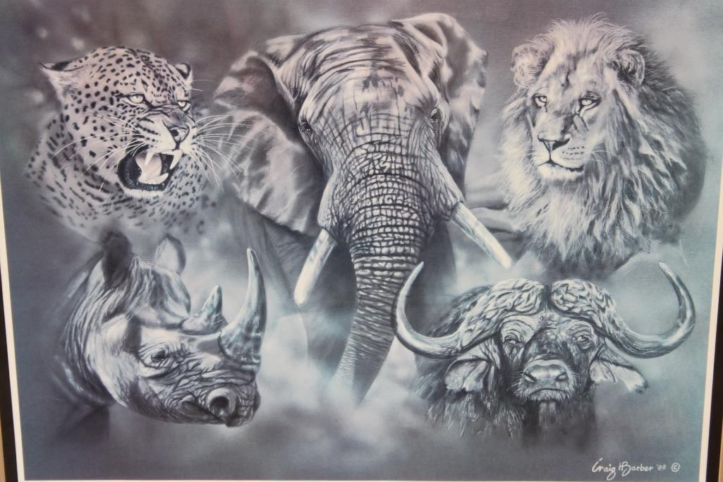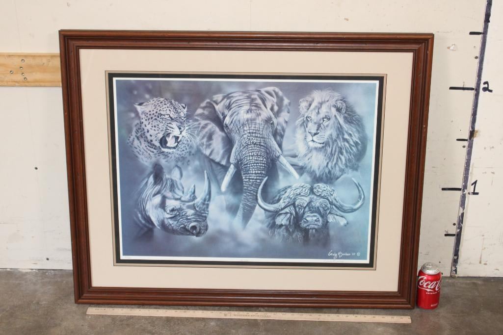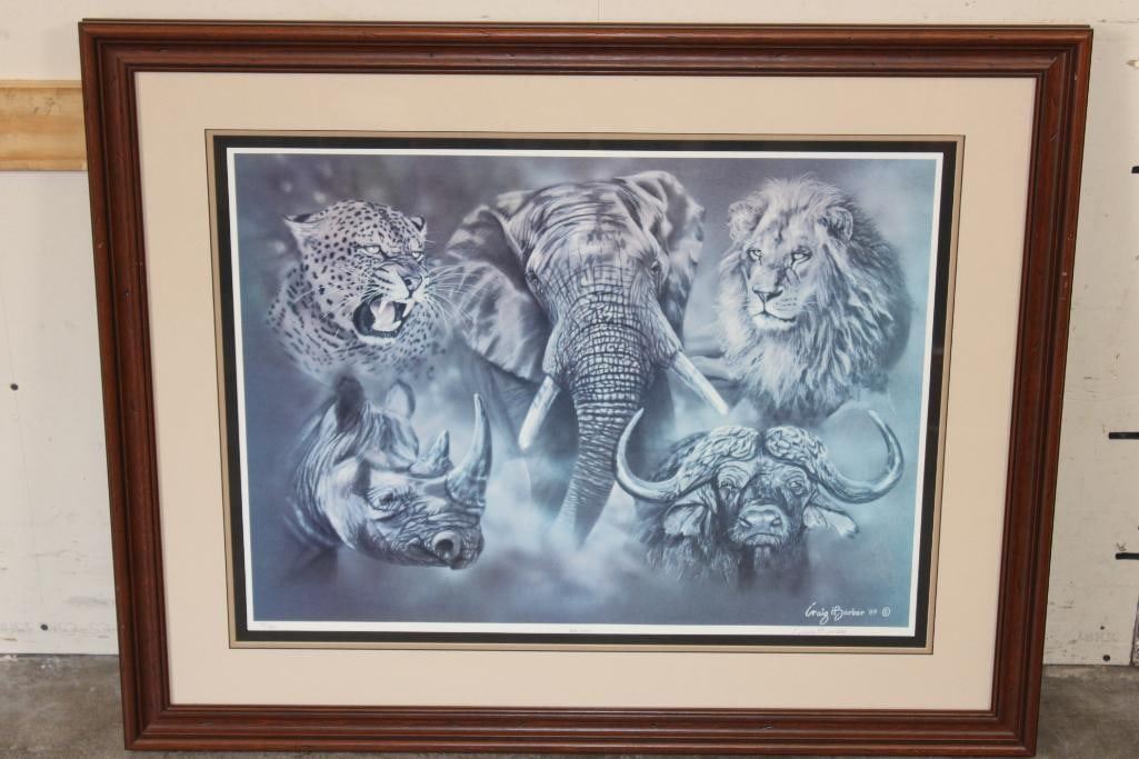 Very Nice "Big Five" Print of a painting signed in Pencil and numbered #65/950 by the artist Craig Hilton-Barber. It has been displayed in a lovely 38" Long x 31" Wide Wooden Frame with Glass. Craig Hilton-Barber was born and raised on a cattle ranch in Zimbabwe surrounded by Africa's natural wonders. He has been painting since childhood and immigrated to Australia in 2009. Barber's work is highly sought after by wildlife enthusiasts and collectors alike. To see a video compilation of the artist's work click the link below: