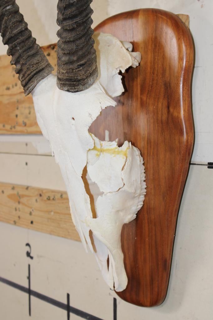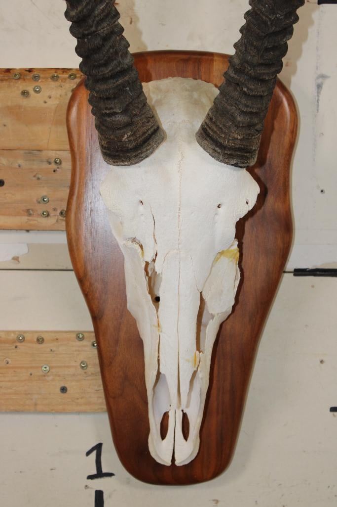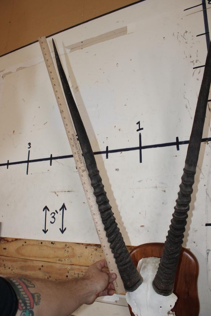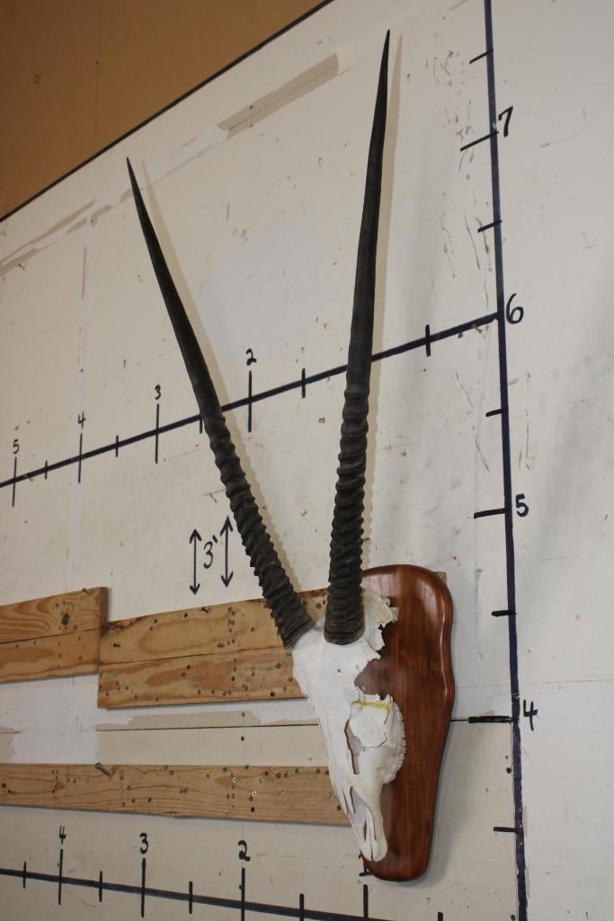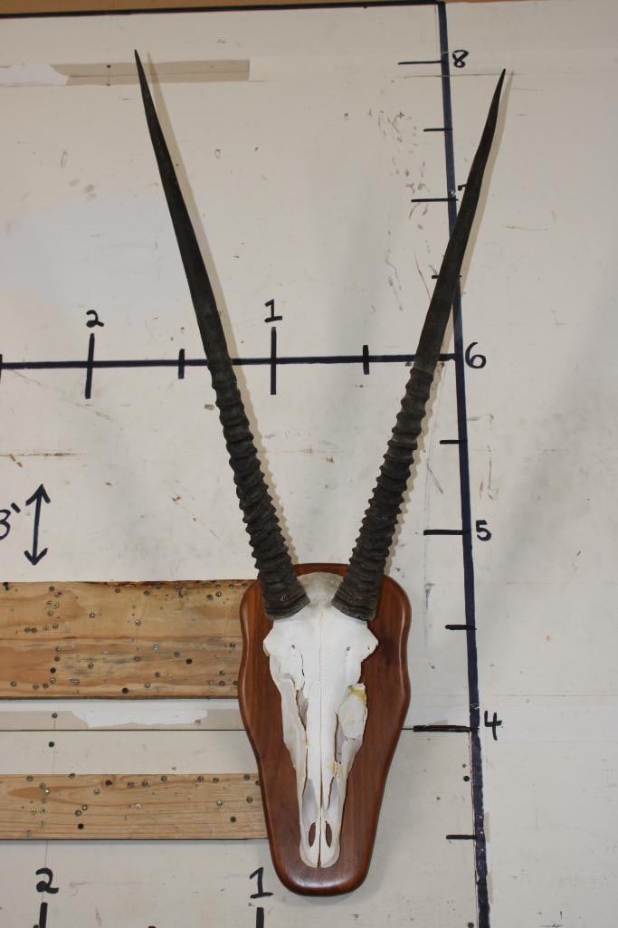Big GEMSBOK Skull on a Wooden Plaque. The Left Horn measures 34.5" Long and the Right Horn measures 35" Long. It has several glue repairs. TAXIDERMY