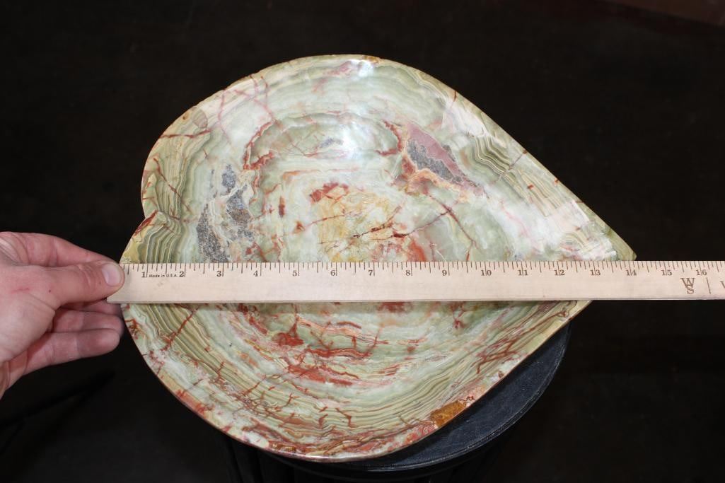 Big GREEN BANDED ONYX Heart Shaped Bowl. It measures 14.25" Long x 12.25" Wide x 3" Tall and the Total Weight is 8 lbs 9 oz. Green banded onyx is a naturally banded stone valued for its visual appeal and metaphysical properties like promoting emotional stability, courage, and clarity. ROCKS MINERALS FOSSILS BOWLS