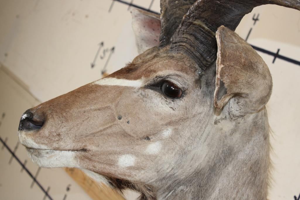 Big KUDU Shoulder Mount. The Left Horn measures 52" around the Spiral Ridge and the Right Horn measures 51" around the Spiral Ridge. The hide is splitting on the back and the ears have some damage. Otherwise it is a nice mount in Good Condition. TAXIDERMY