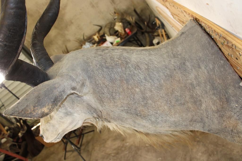 Big KUDU Shoulder Mount. The Left Horn measures 46.5" around the Spiral Ridge and the Right Horn measures 46" around the Spiral Ridge. It has a few rubs and blemishes. TAXIDERMY