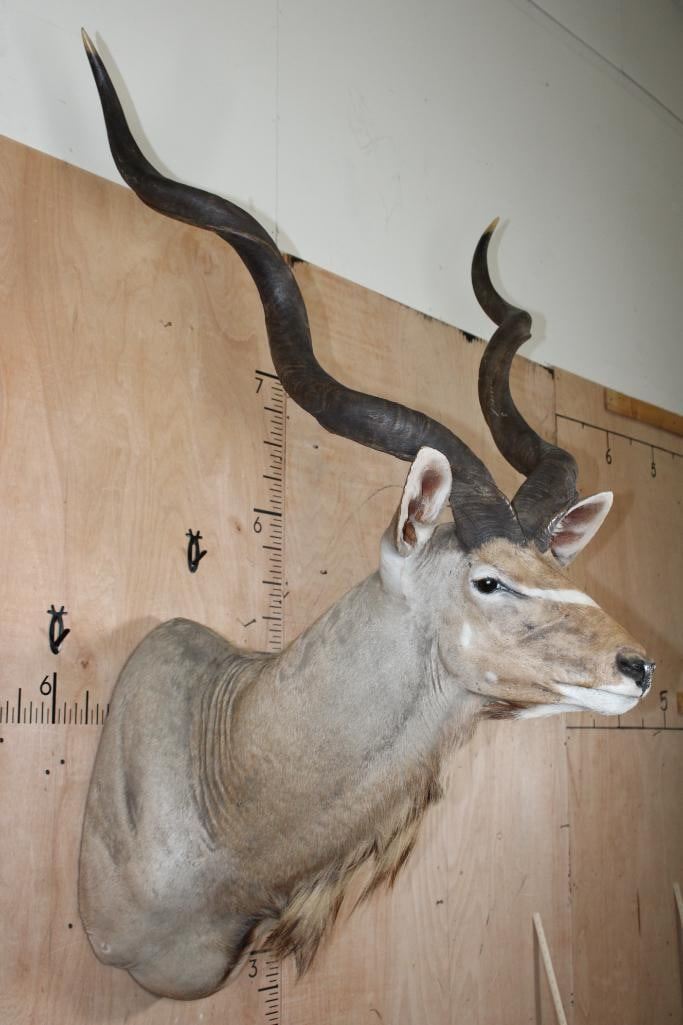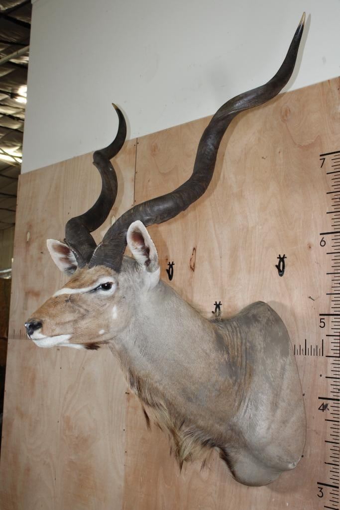 Nice, Clean, and Newer KUDU Shoulder Mount. The Left Horn measures 51 5/8" around the Spiral Ridge and the Right Horn measures 52 5/8" Long around the Spiral Ridge. It is in Good Condition. TAXIDERMY