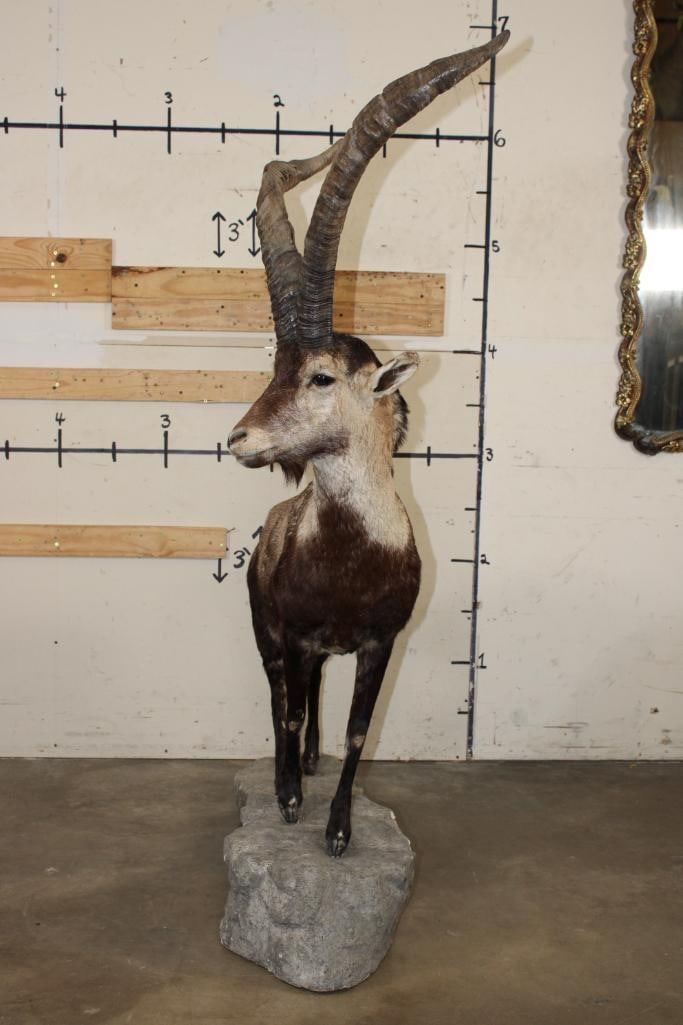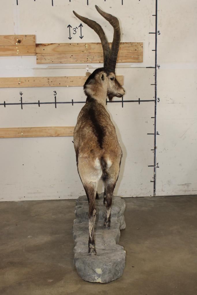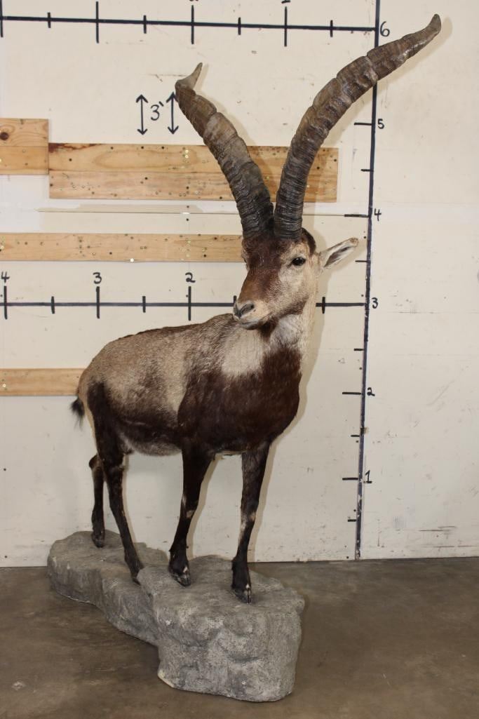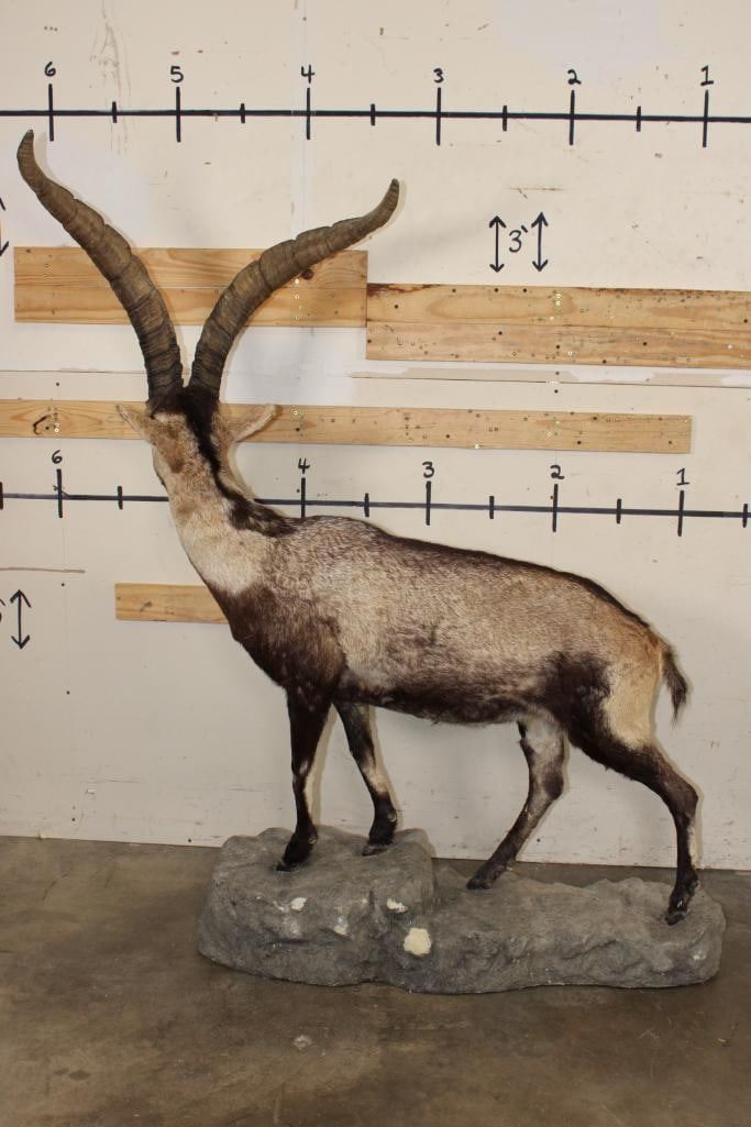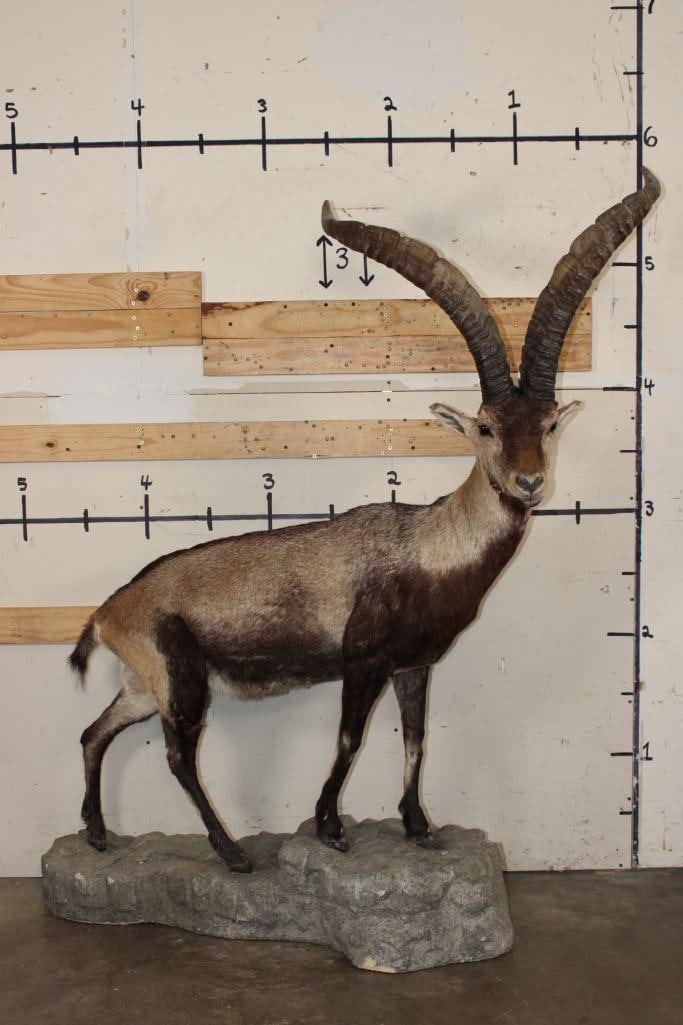 Very Nice, Clean, and Newer Life-sized GREDOS IBEX. The Left Horn measures 28.5" Long and the Right Horn measures 29.25" Long. It is on a light weight foam simulated Rock Base. The Total Mount measures 57" Long x 18" Wide x 67" Tall. It is in Good Condition. TAXIDERMY