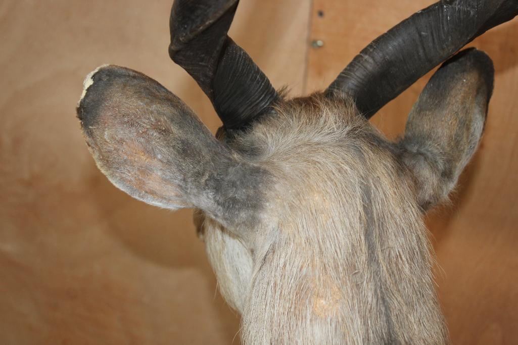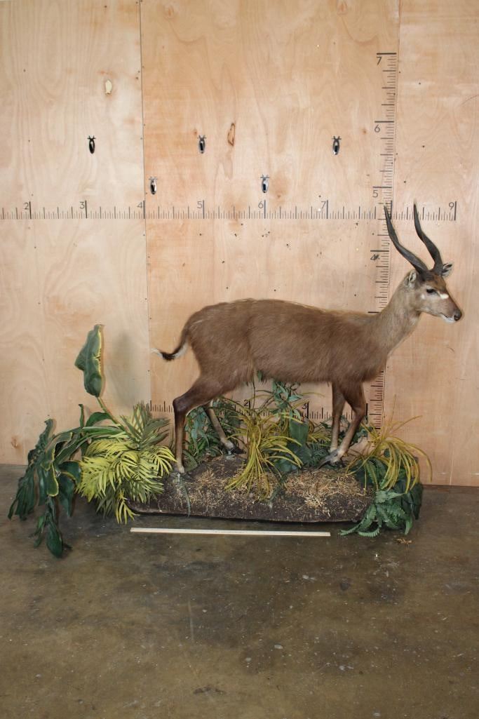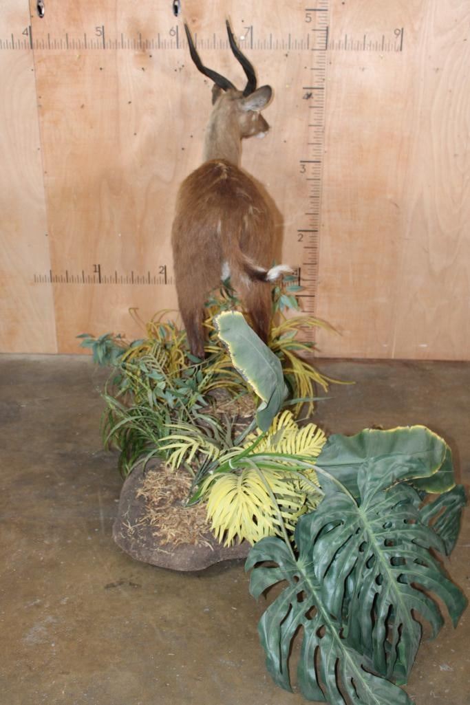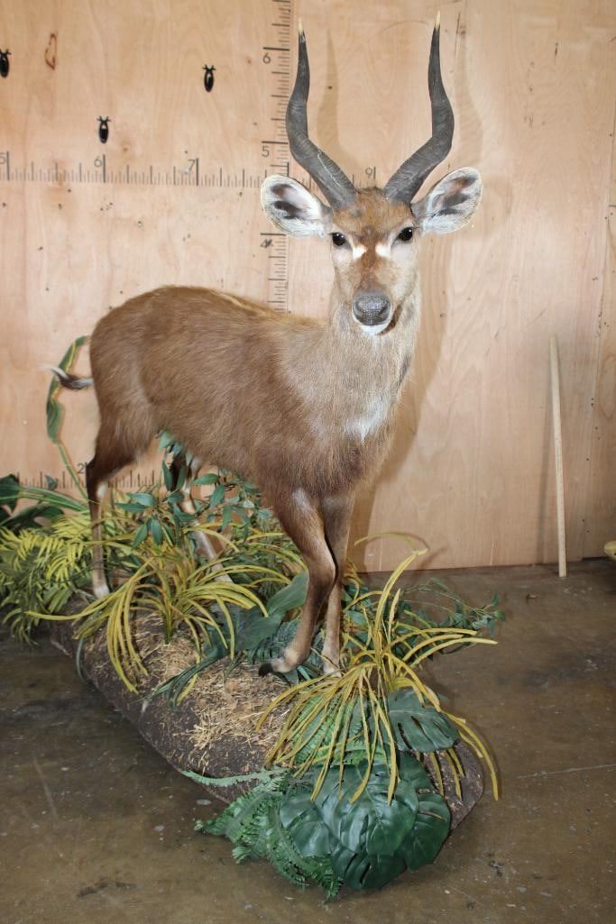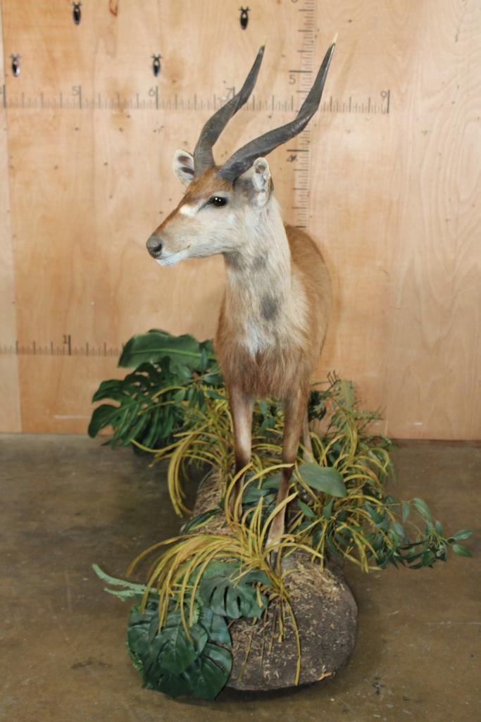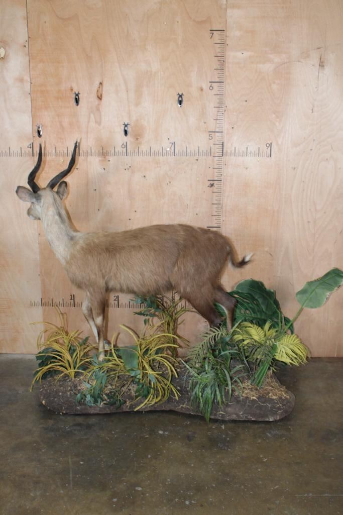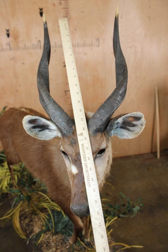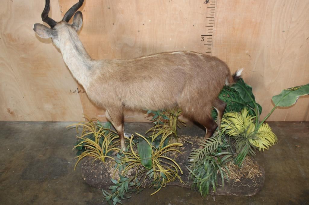 Nice and Big Life-sized SITATUNGA. The Left Horn measures 17 3/8" and the Right Horn measures 17.25" around the Spiral. It is mounted on a Decorative Base with Wheels. The Total Mount measures 70" Long x 24" Wide x 59" Tall and is in Good Condition. TAXIDERMY
