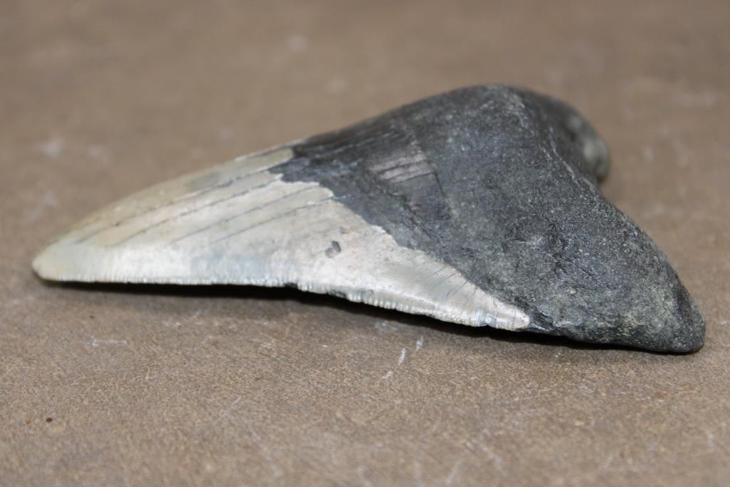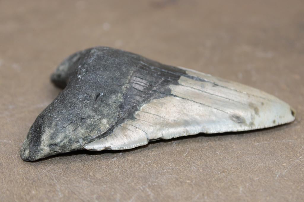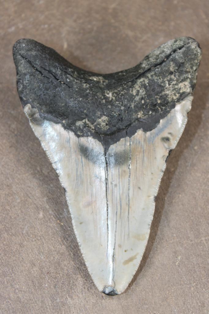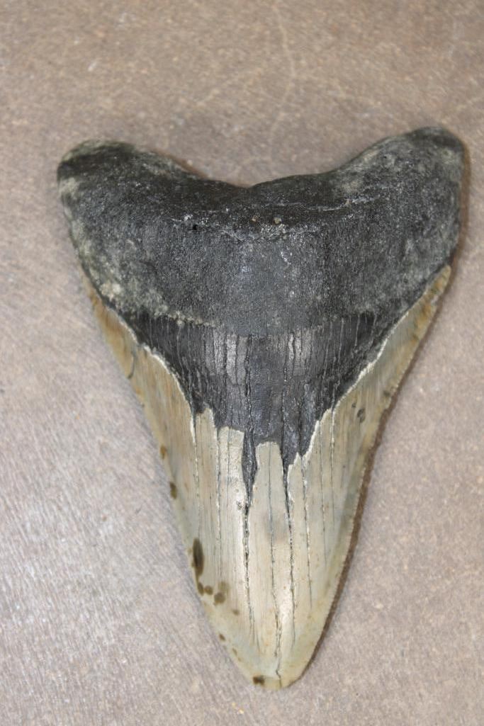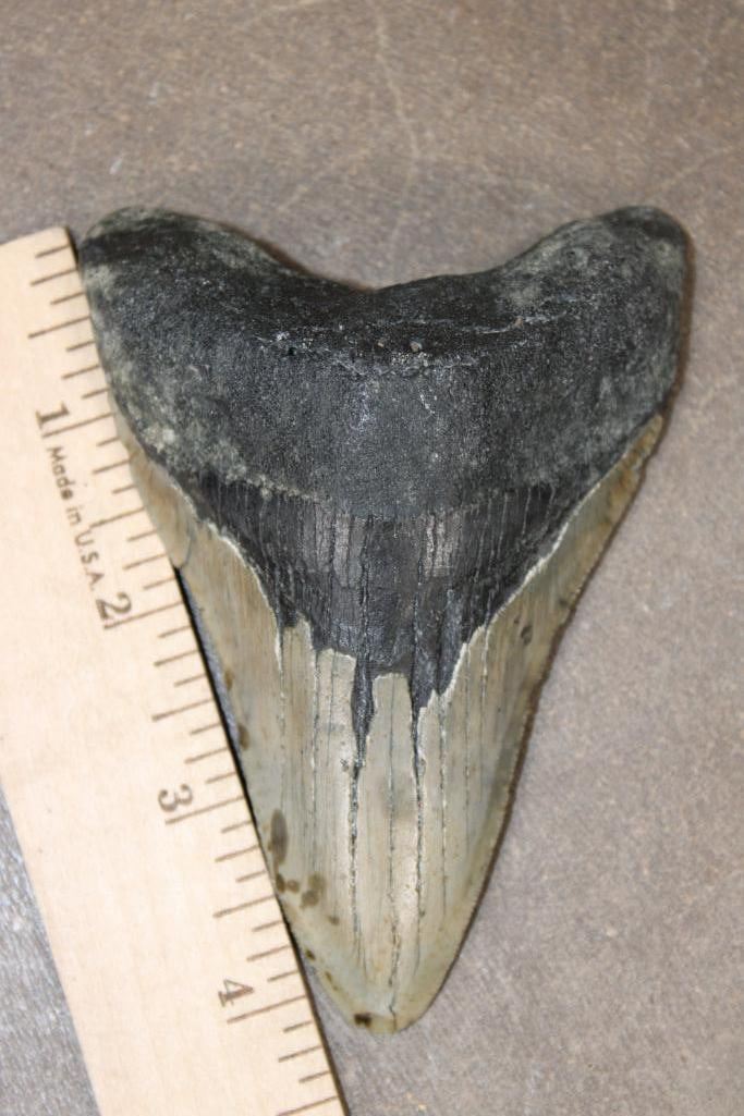 Big MEGALODON SHARK Tooth Fossil. It measures 4.25" Long x 3" Wide and Weighs 171.12 grams or 6.036 oz. Megalodon, meaning "large tooth" in Greek, is an extinct species of shark known for its massive heart shaped teeth. SHARK TOOTH FOSSILS