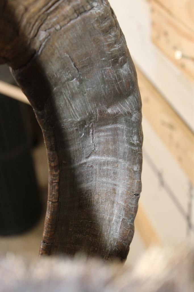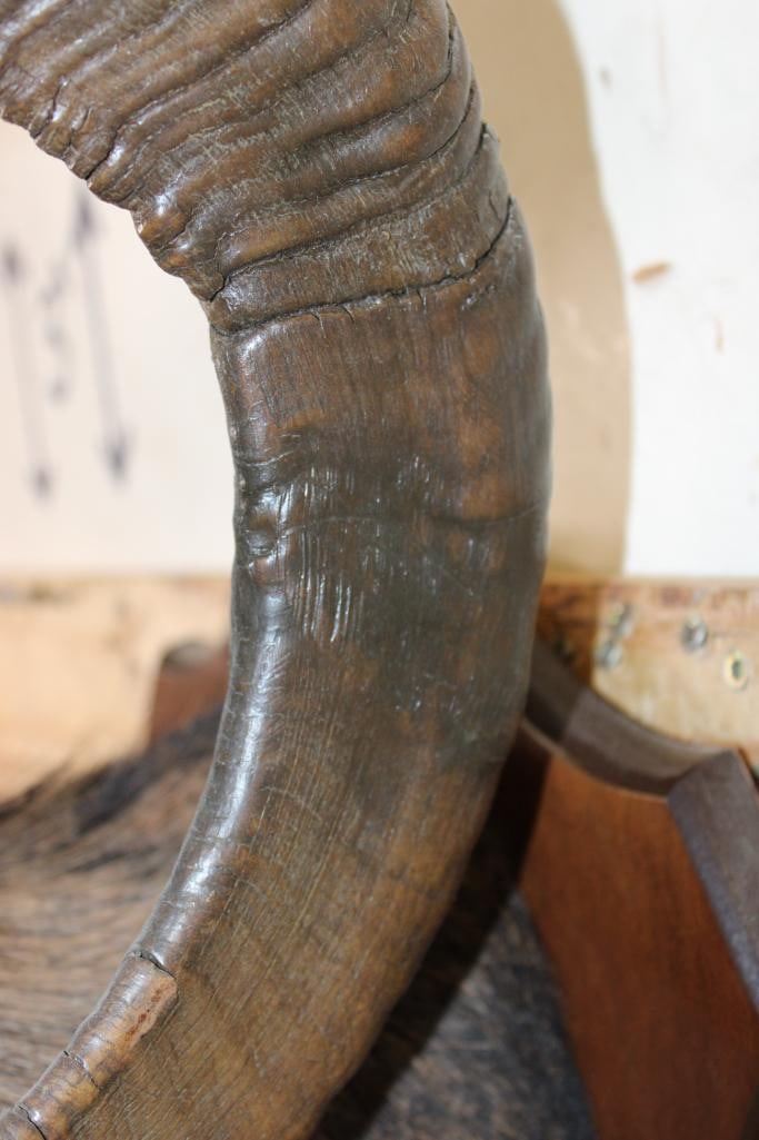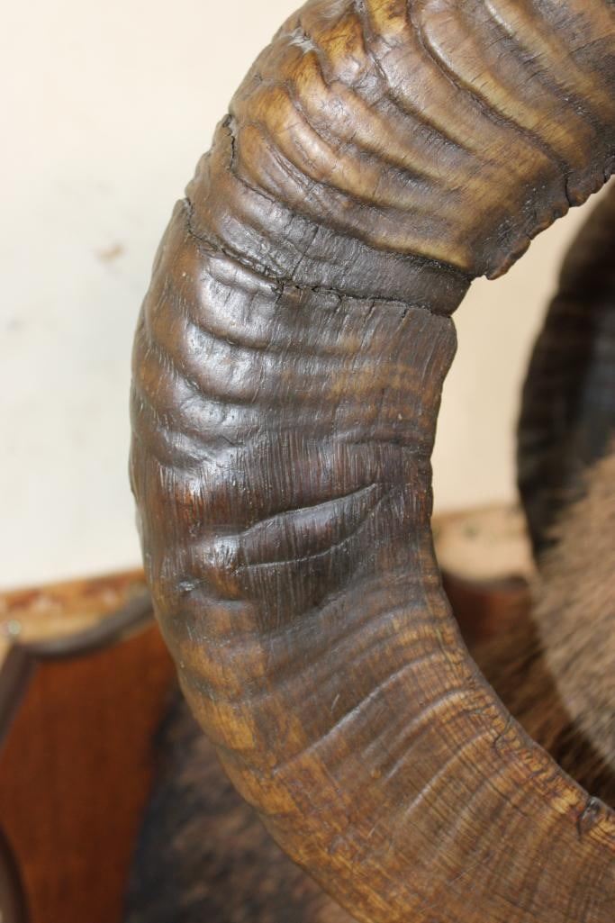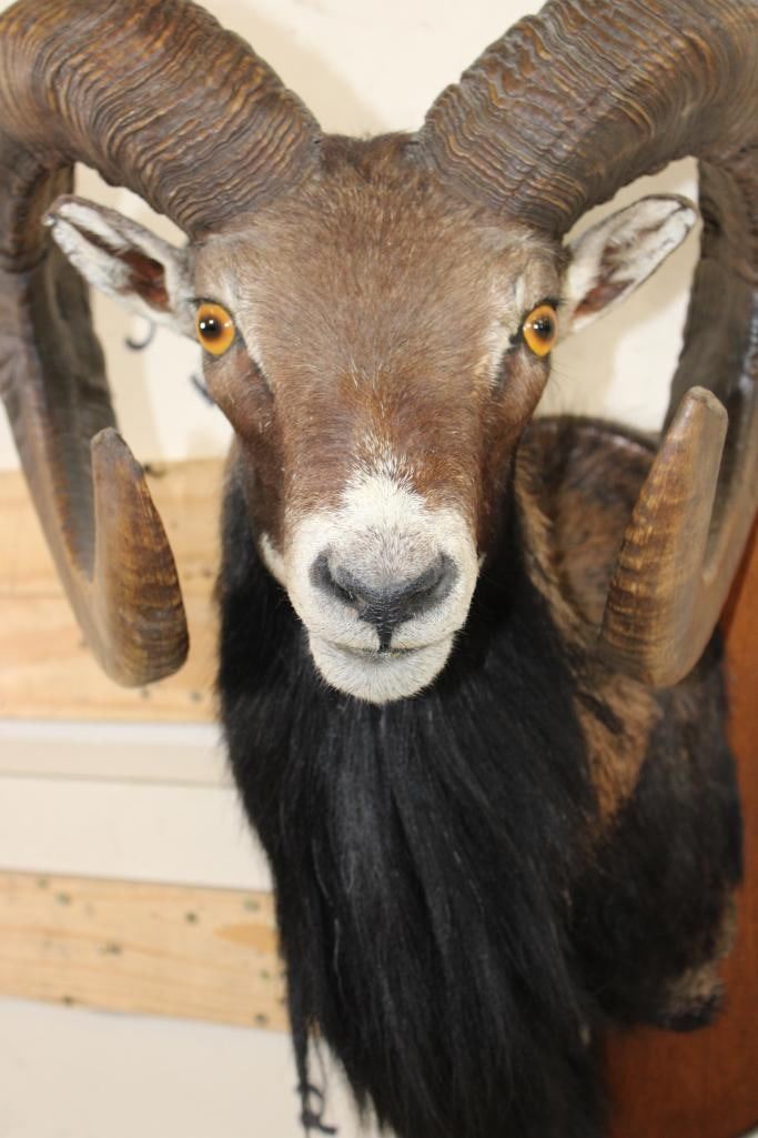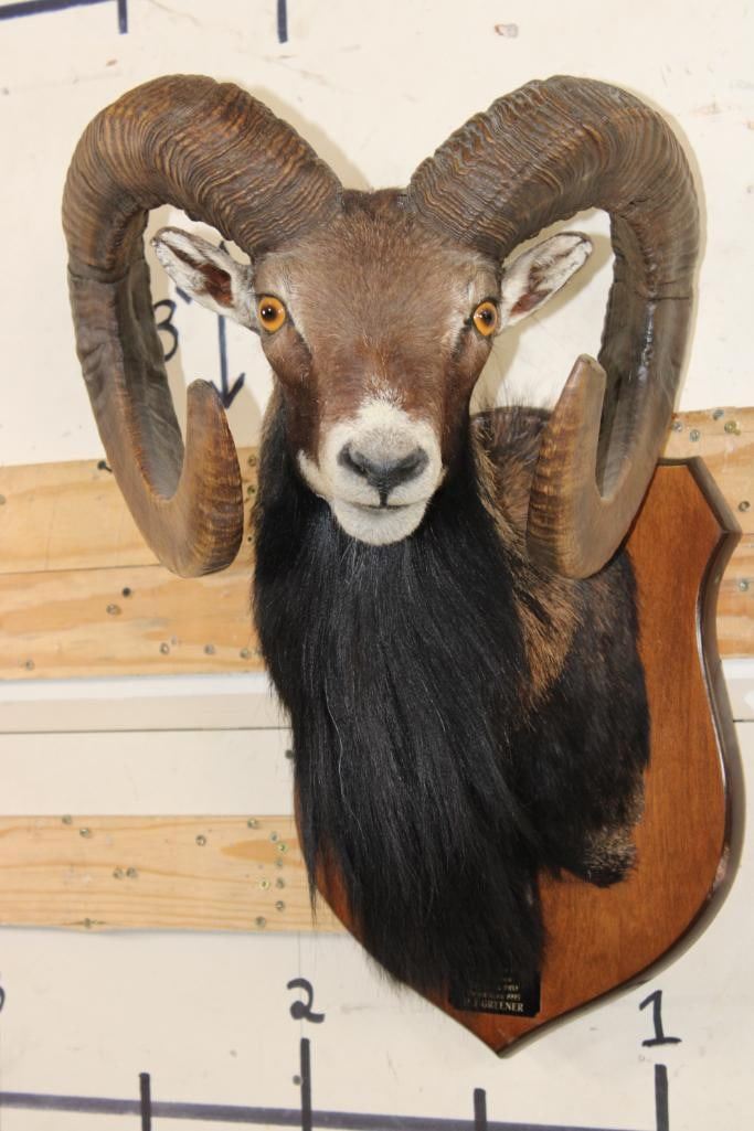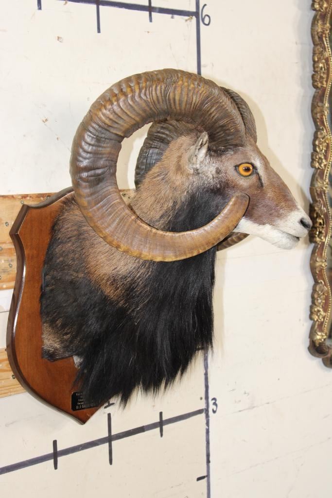 Big MOUFLON Shoulder Mount with modified real horns. The mount is modeled after the Ram Taken at the "Real Ranch Utopia, Texas 1980". The Left Horn measures 36 7/8" Long and 9.5" around the Horn Base. The Right Horn measures 36.25" Long and 9.25" around the Horn Base. COLLECTIBLE TAXIDERMY