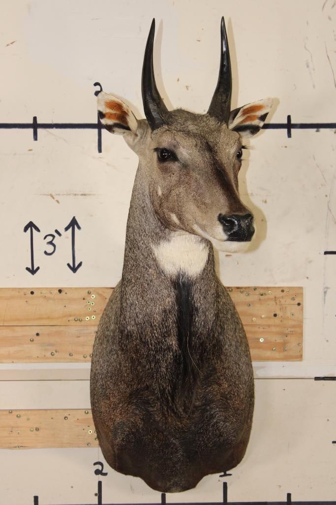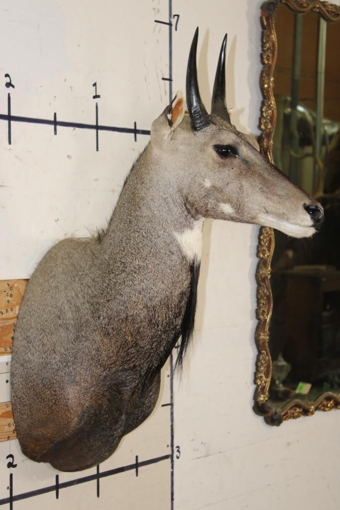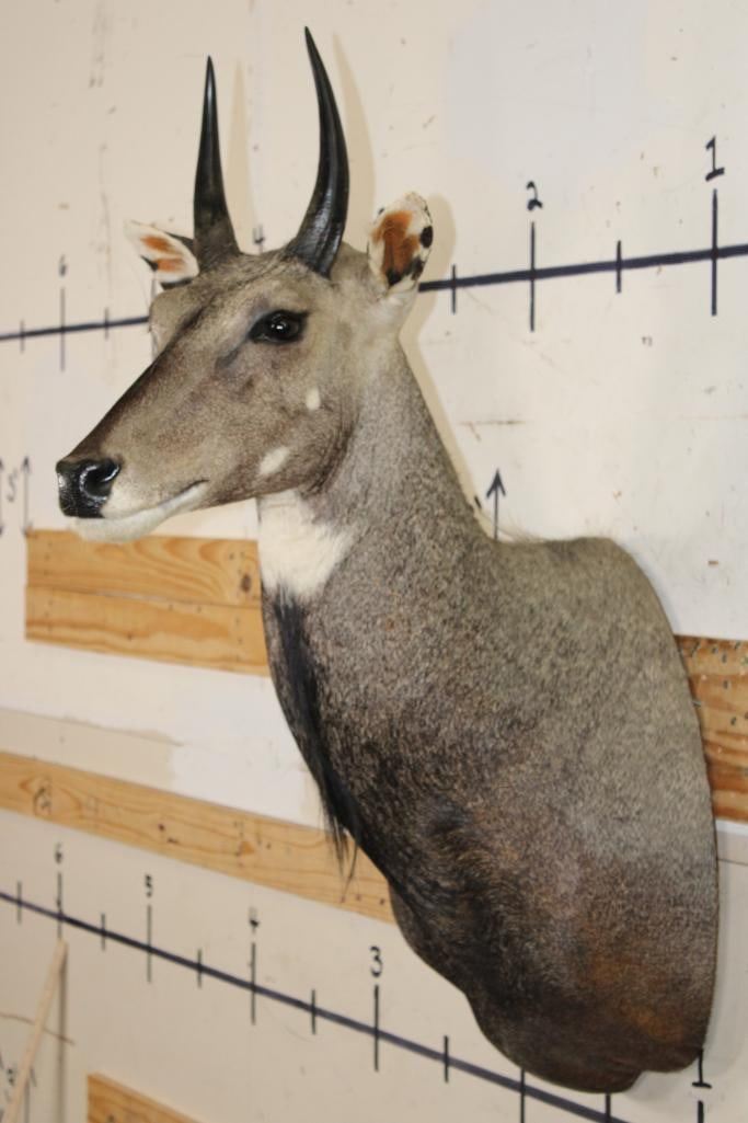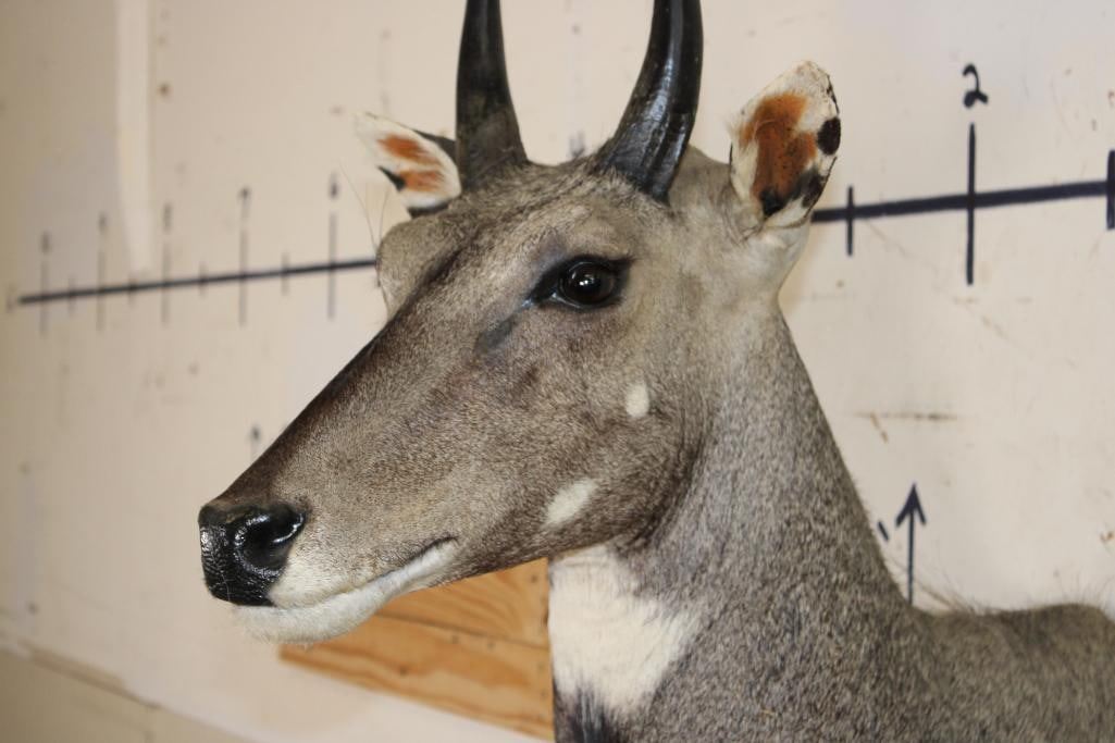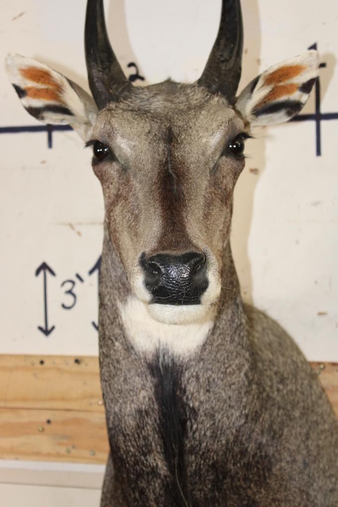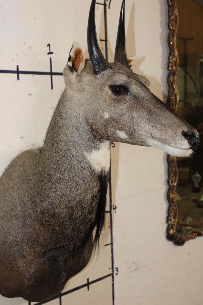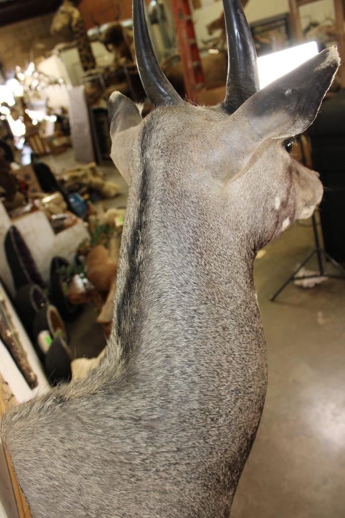 Very Nice, Newer, and Clean NILGAI Shoulder Mount. He is Big and has 9" Long Horns. It is in Very Good Condition. TAXIDERMY