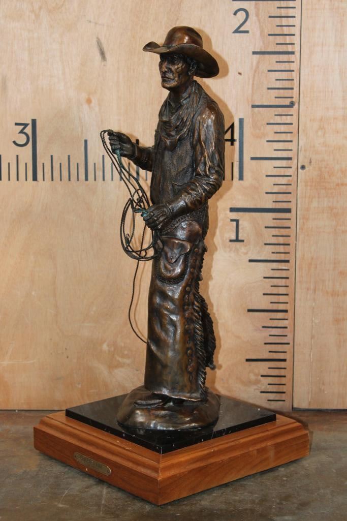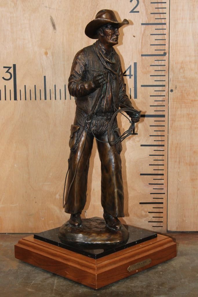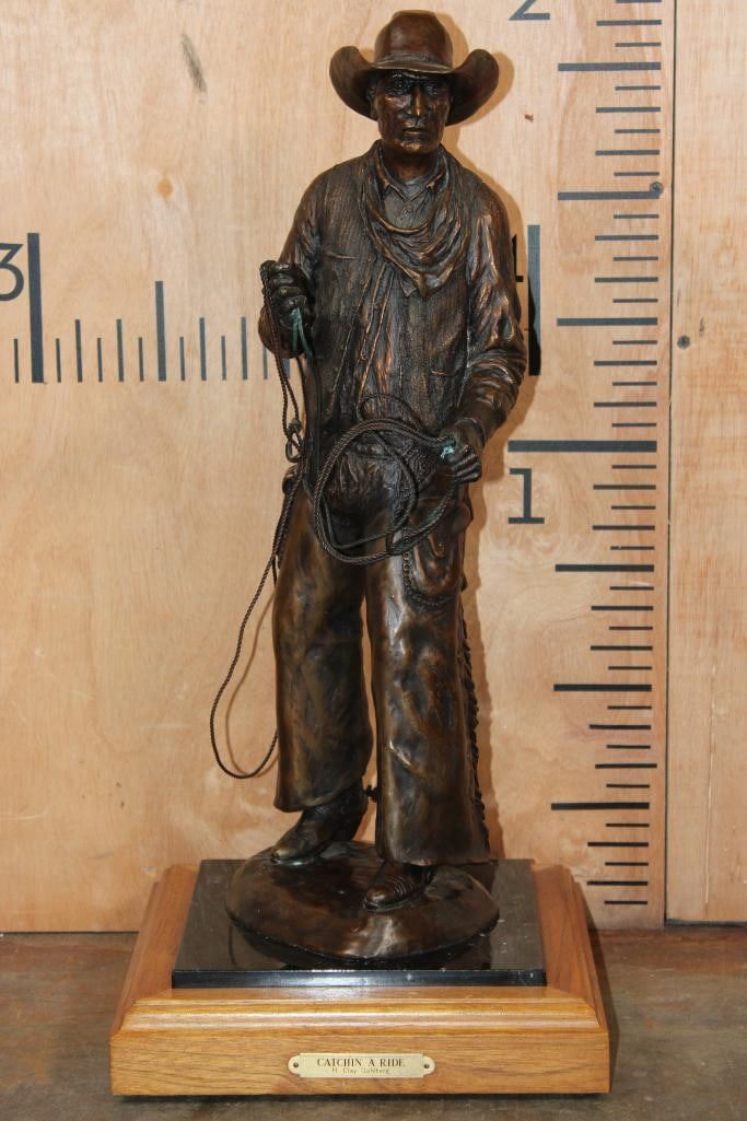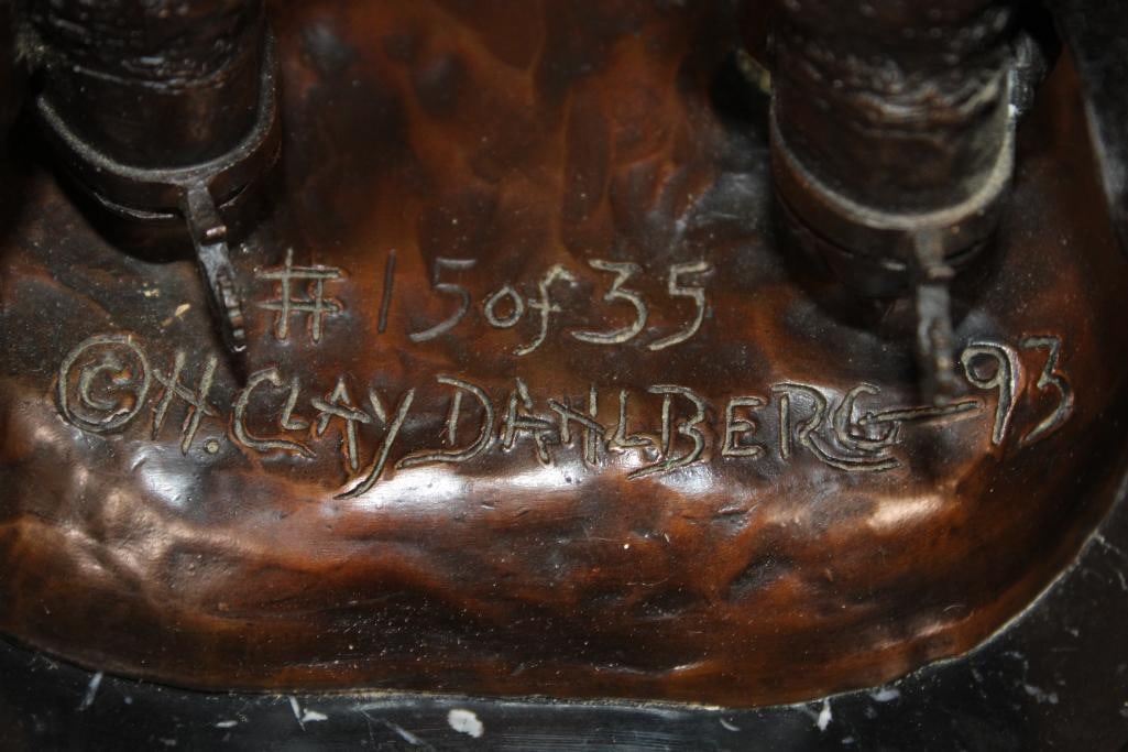 Big Original "Catchin' A Ride" 1993 Bronze SCULPTURE by Houston Clay Dahlberg (1946-2021). This Sculpture is Signed and Numbered Limited Edition #15/35 and is mounted on a Marble and Wood Base. It measures 22.5" Tall x 10.5" Wide x 10.5" Depth and Weighs 31 lbs. Texas artist H. Clay Dahlberg was commissioned for many sculptures including: A life-sized portrait bust for the Courthouse Square in Georgetown, TX, a 7' Tall sculpture entitled "Rough Men and Tough Times, Y.O. Ranch Hotel Kerrville, TX, a life-sized standing figure portrait of Col. E.S.C. Robertson in Salado, TX, a life size portrait bust of Homer Bryce at Stephen F. Austin University in Nacogdoches, TX. The story of Clay's life and artwork is found in Memories of Horses and Wars, The Sculpture of Clay Dahlberg written by Don Hedgpeth. COLLECTIBLE BRONZE ART