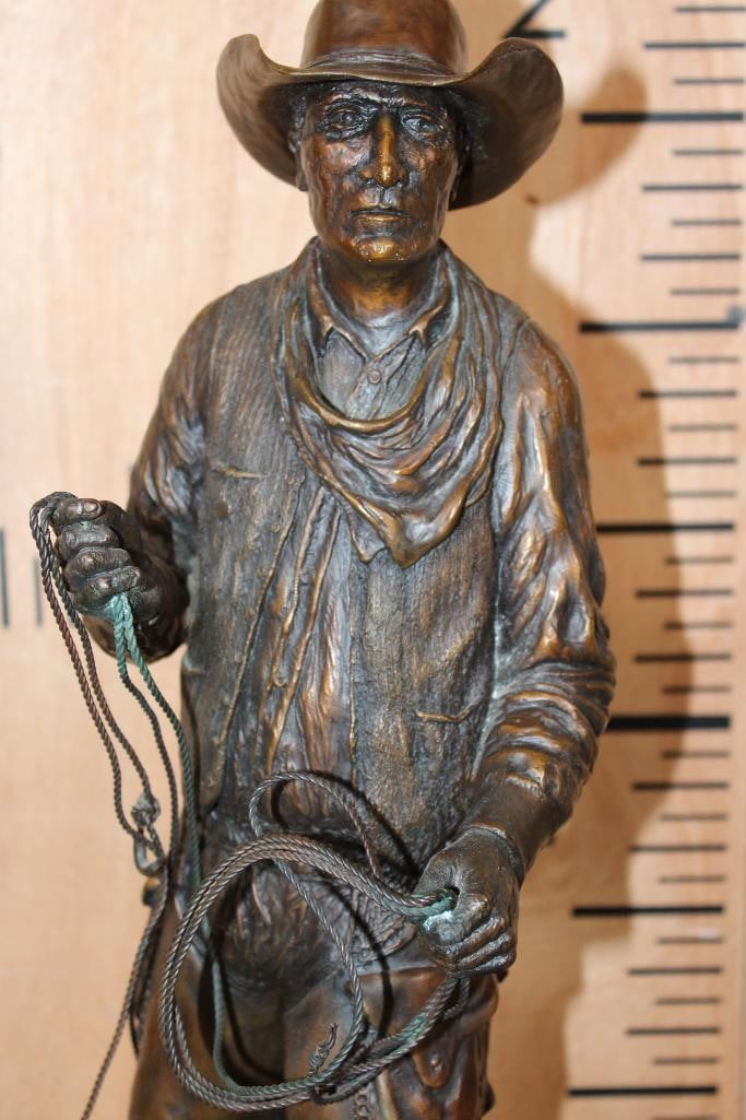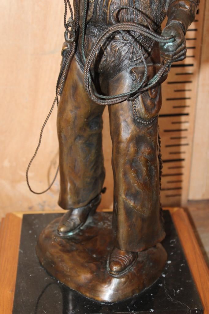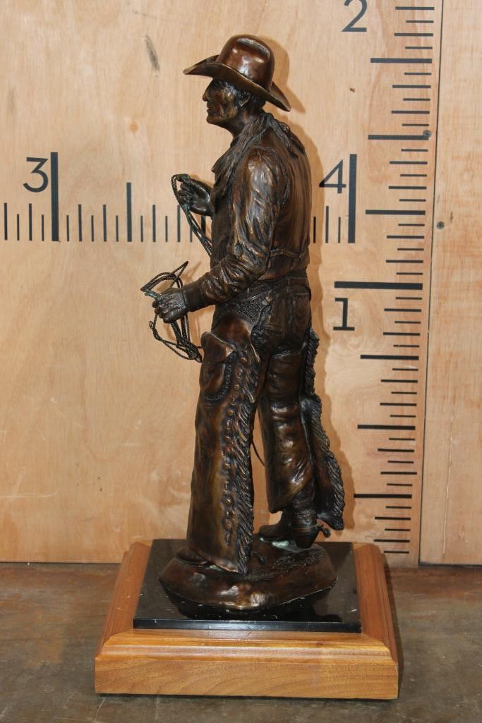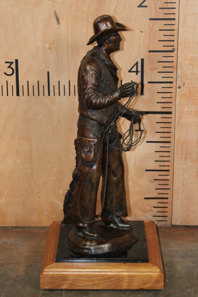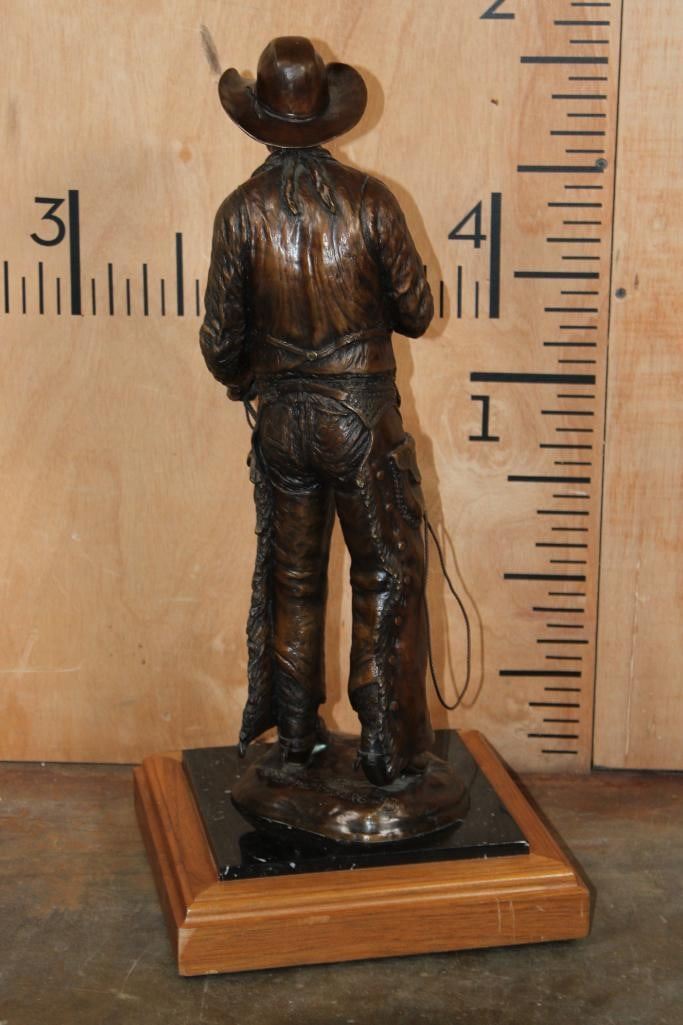 Big Original "Catchin' A Ride" 1993 Bronze SCULPTURE by Houston Clay Dahlberg (1946-2021). This Sculpture is Signed and Numbered Limited Edition #15/35 and is mounted on a Marble and Wood Base. It measures 22.5" Tall x 10.5" Wide x 10.5" Depth and Weighs 31 lbs. Texas artist H. Clay Dahlberg was commissioned for many sculptures including: A life-sized portrait bust for the Courthouse Square in Georgetown, TX, a 7' Tall sculpture entitled "Rough Men and Tough Times, Y.O. Ranch Hotel Kerrville, TX, a life-sized standing figure portrait of Col. E.S.C. Robertson in Salado, TX, a life size portrait bust of Homer Bryce at Stephen F. Austin University in Nacogdoches, TX. The story of Clay's life and artwork is found in Memories of Horses and Wars, The Sculpture of Clay Dahlberg written by Don Hedgpeth. COLLECTIBLE BRONZE ART