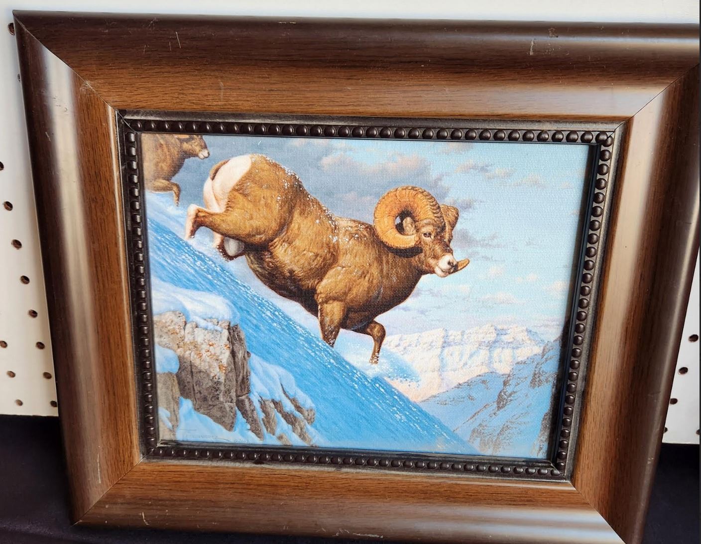 Framed photo of a bighorn sheep on a mountain.