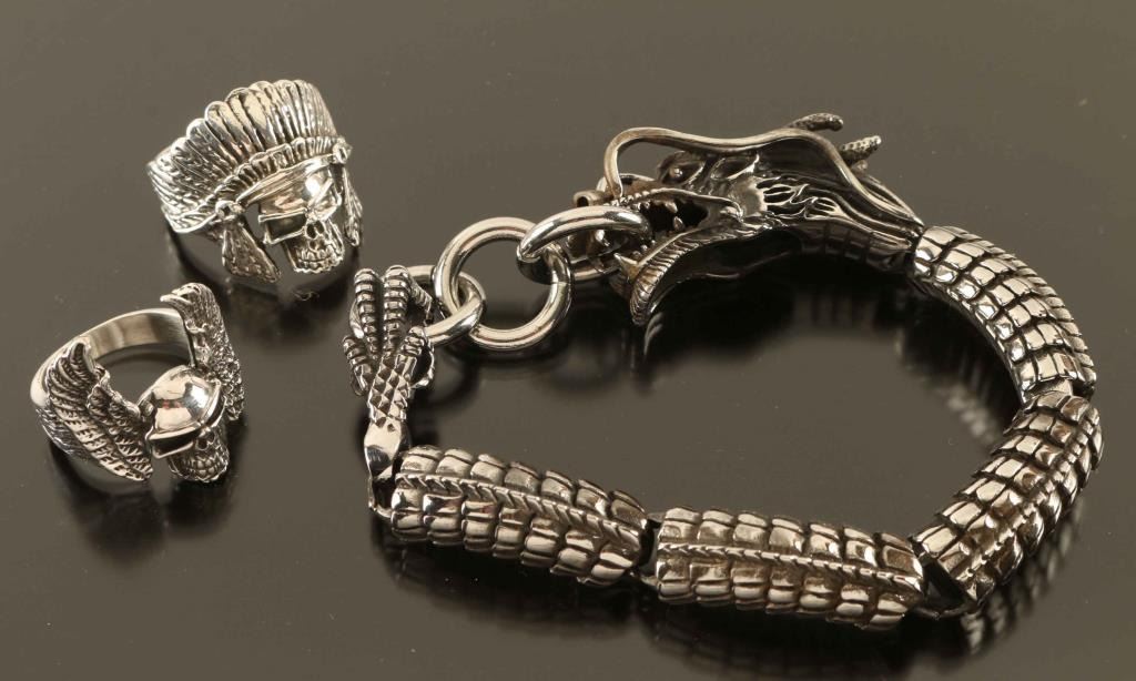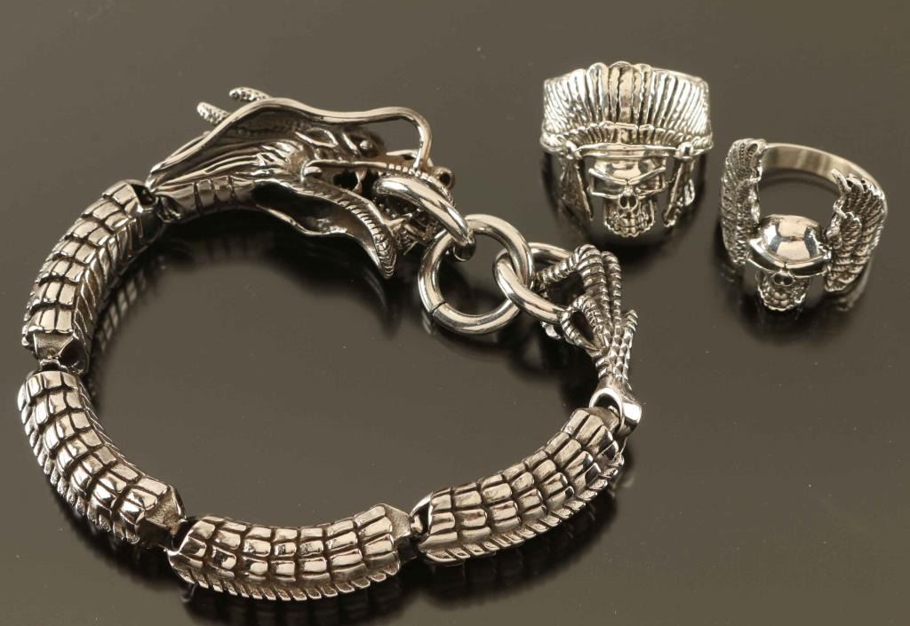 Biker Skull and Wings Ring, Indian Chief with head dress, and a Silver Link Dragon Bracelet