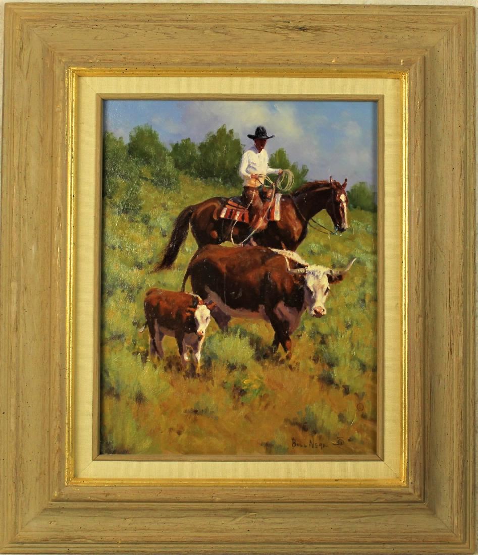 Framed oil on board of cowboy on horseback, steer and calf by Bill Neal (2005); approximately 22x 19 overall; titled “A Little Encouragement.