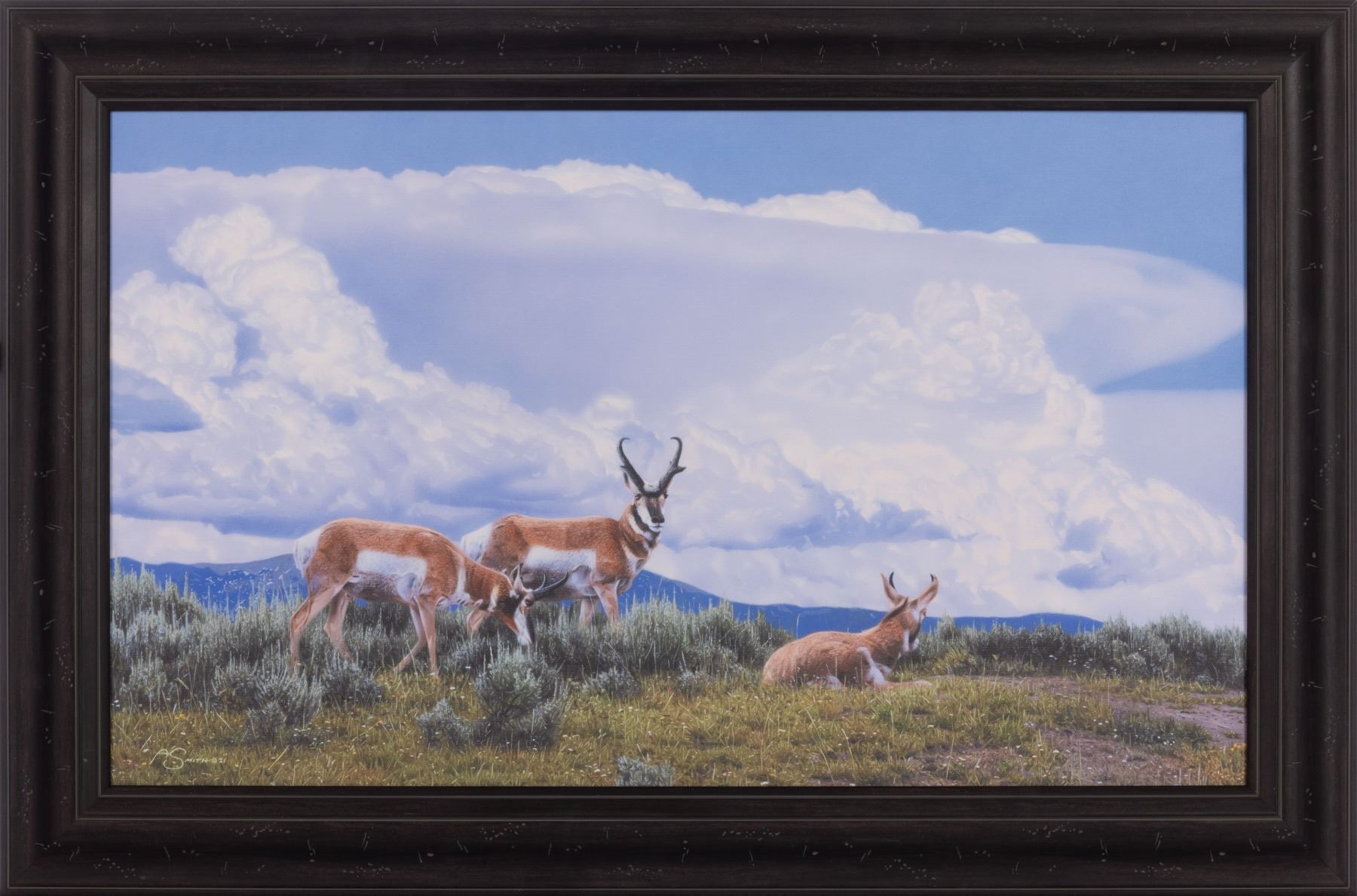 "Billowing Skies" by Adam Smith transports viewers into a scene of natural majesty, showcasing pronghorns in an expansive landscape under a dramatic sky filled with dynamic cloud formations. Adam Smith's painting captures the essence of the open plains and the vastness of the sky, emphasizing both the grace of the pronghorns and the ever-changing beauty of the clouds above. Adam comes from a family of artists; his father, Daniel Smith, is also renowned for his artistic achievements, creating a legacy of artistic talent and passion for nature within the family. Through "Billowing Skies," Adam Smith invites viewers to appreciate the harmonious interaction between wildlife and their environment, rendered with skill and sensitivity to the natural world.
