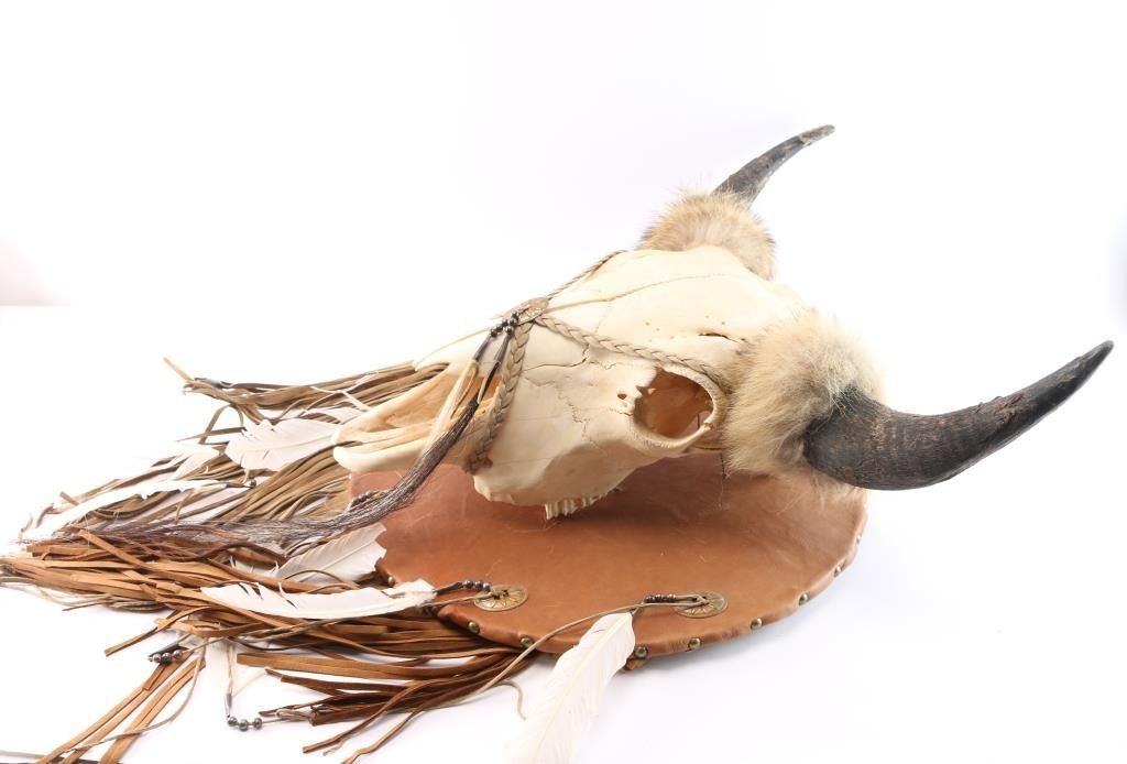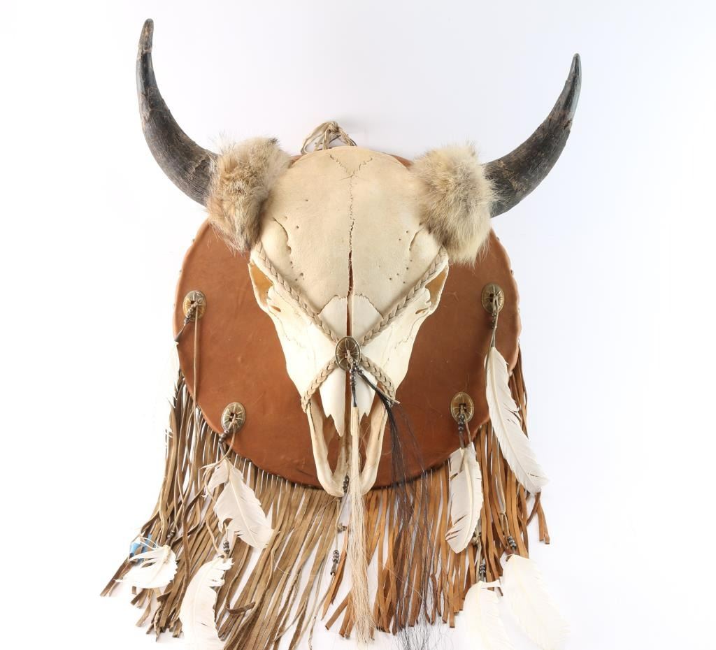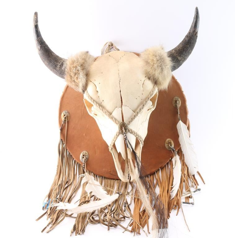 Bison Skull mount with fur around horn bases, braided leather with concho and horse hair fringe. Mounted to leather shield with fringe and feathers