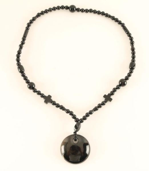 Circular beads alternate with oblong, cross and larger round beads for an interesting ensemble that ends in a large black 2" disc.