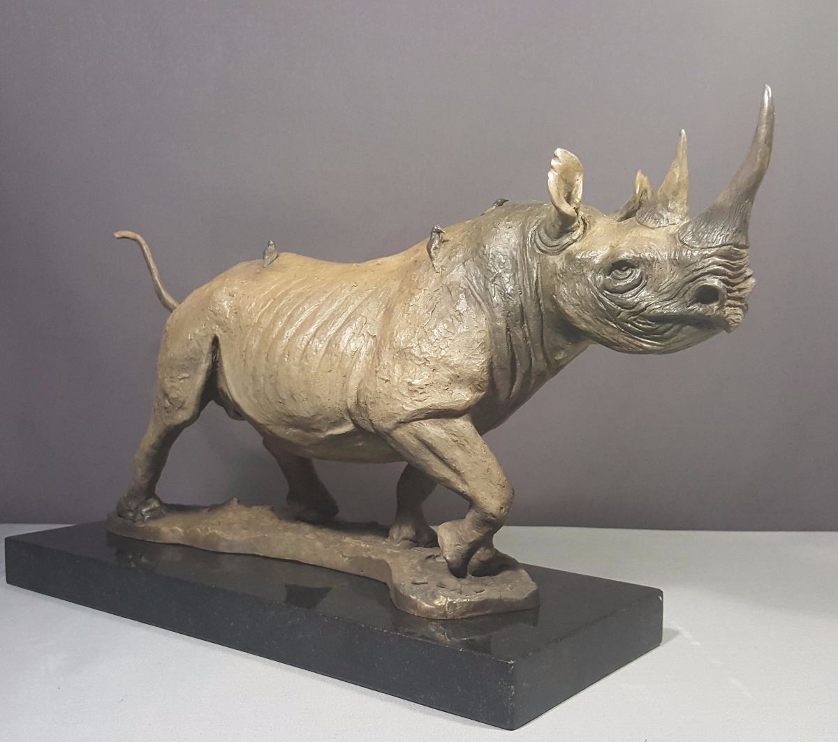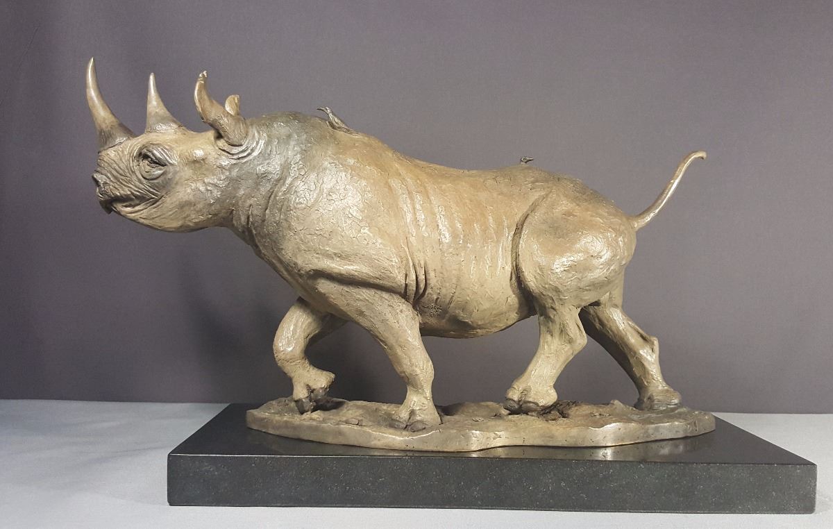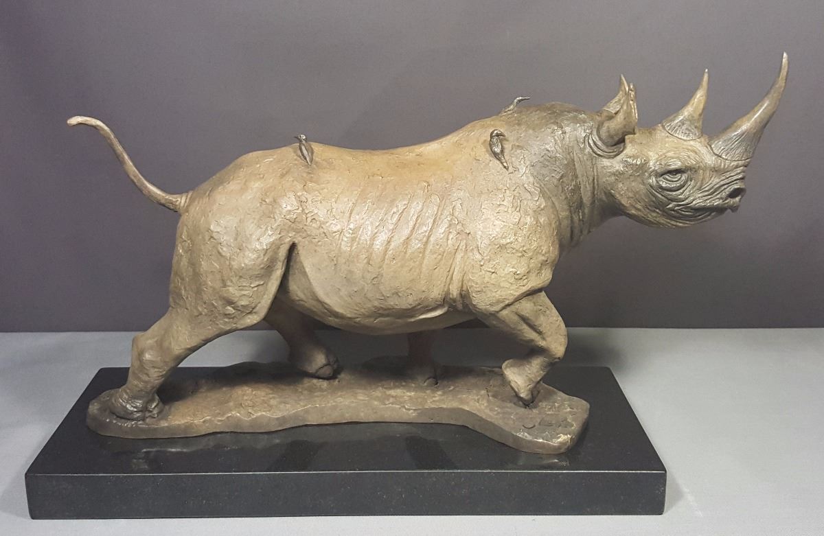 The sculpture shows the Black Rhino as part of the “Big Five” of Africa. Because of its poor eyesight this animal is very vulnerable and will attack rather than flee.