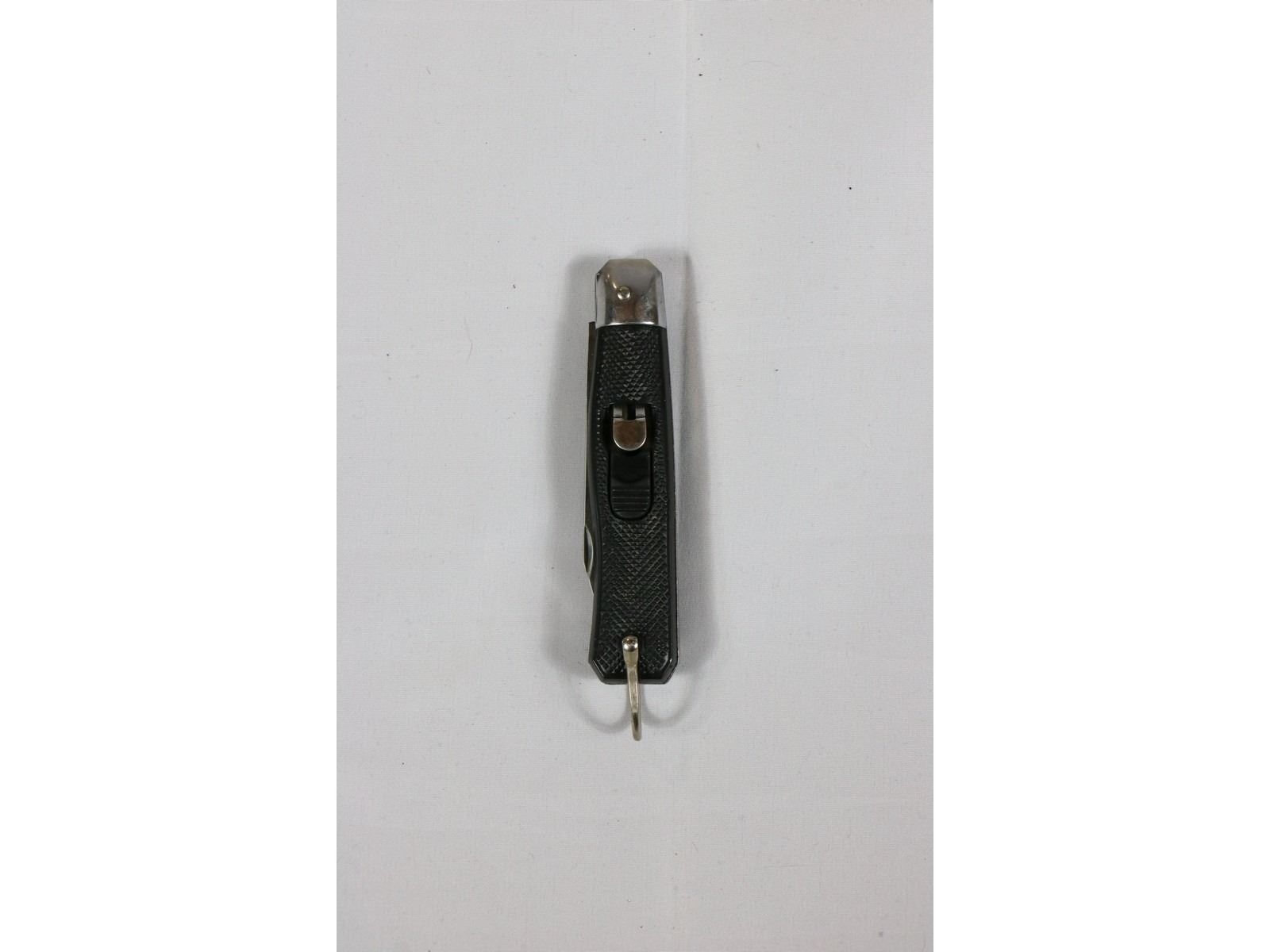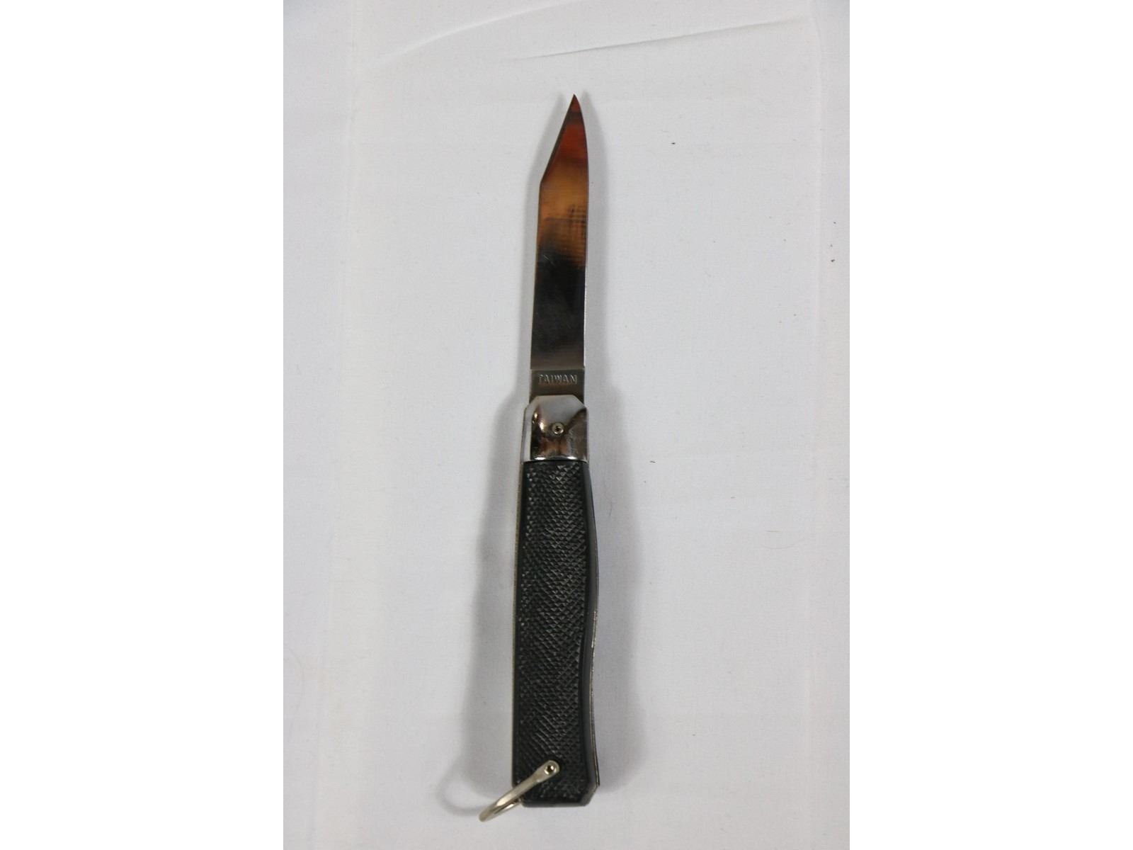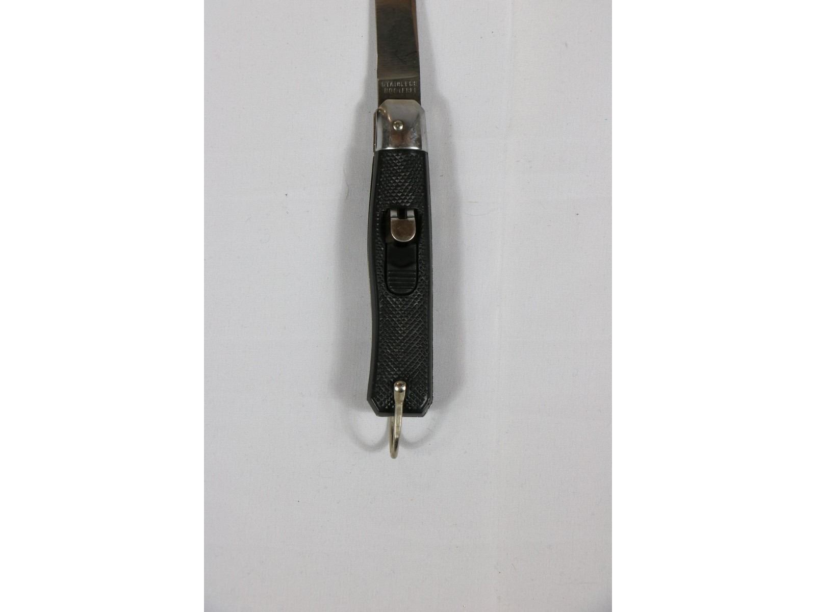 Type: side opening. Country: Taiwan. Mfg: unknown. Release: push lever. Length: 7 1/8". Scales: checkered black plastic. Bolsters: nickel. Liner: steel. Tang markings: Stainless Rosterei Taiwan. Condition: new w/o box.