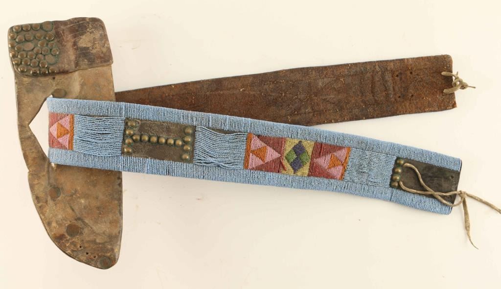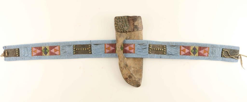 Multicolored fully beaded belt accented with brass tacks includes leather knife scabbard with brass tacks.