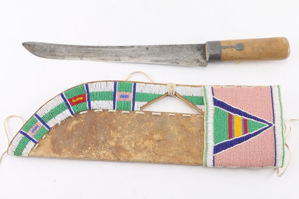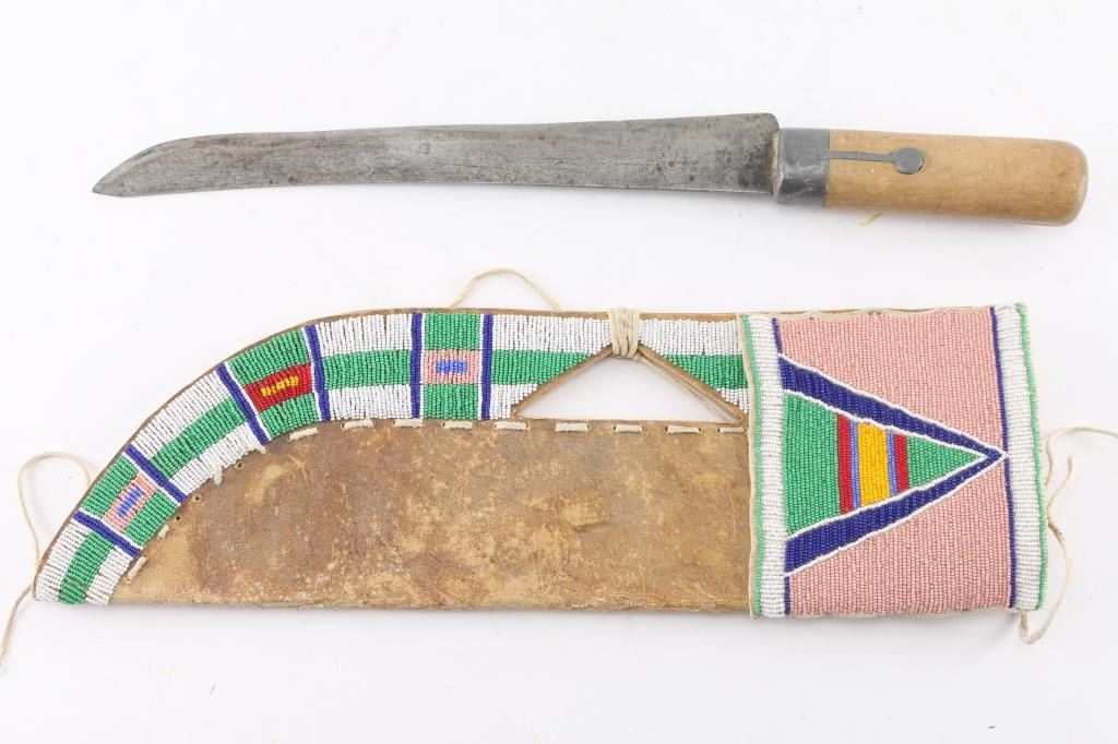Leather scabbard with beaded design on one side includes a trade knife with wood handle 16" with a 11" blade.