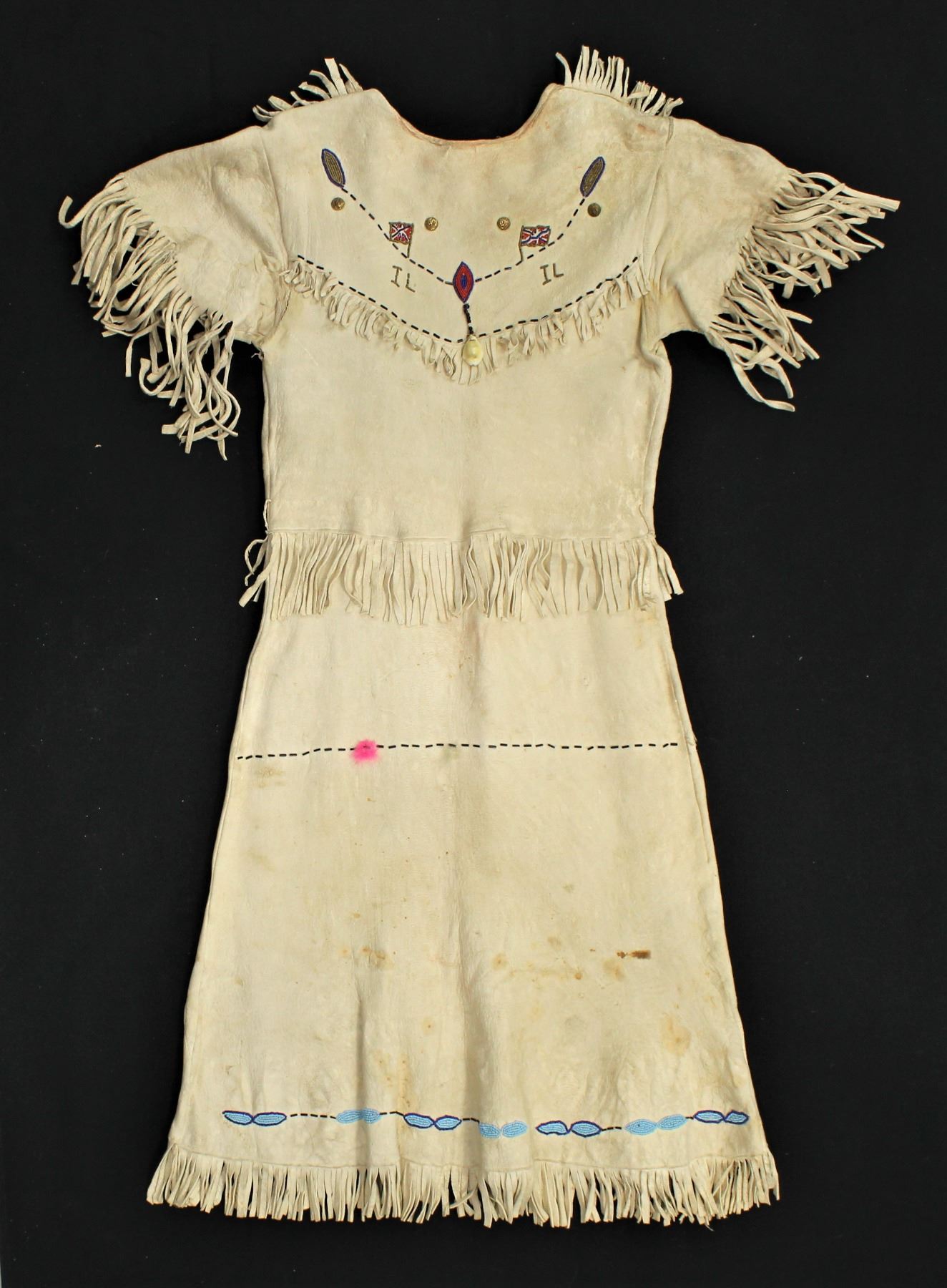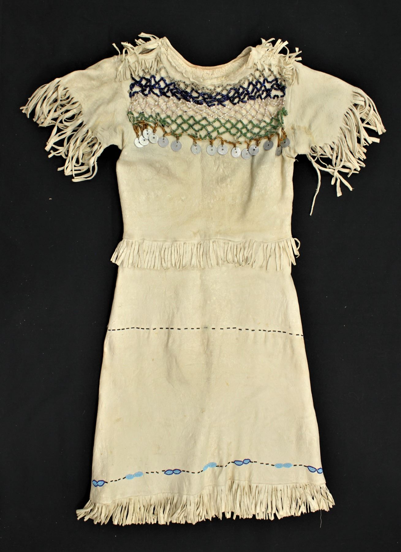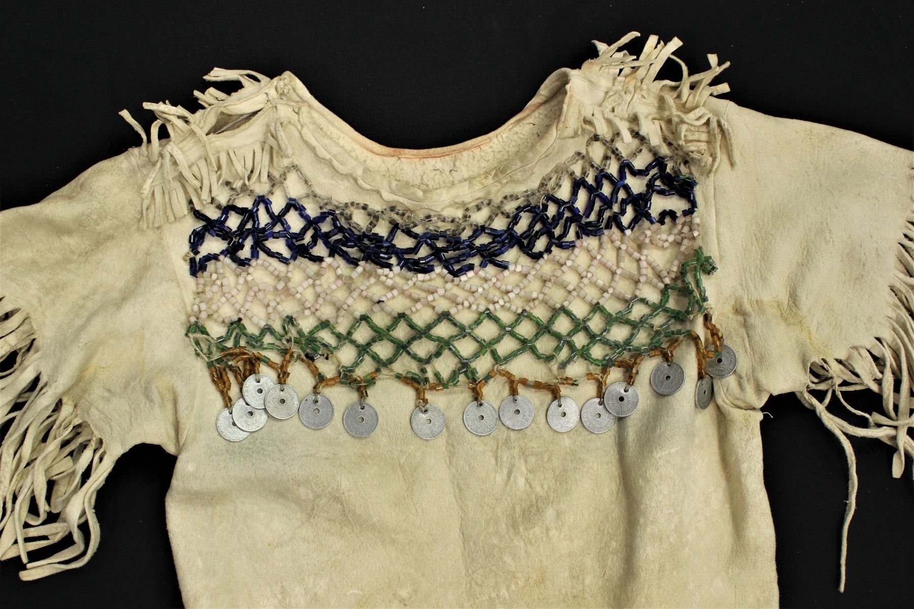 An attractive young woman's buckskin dress, with decoratively done yoke of tube beads fringed with Washington State Tax tokens, accented by buckskin fringe and beaded trim. In excellent condition, circa 1910.