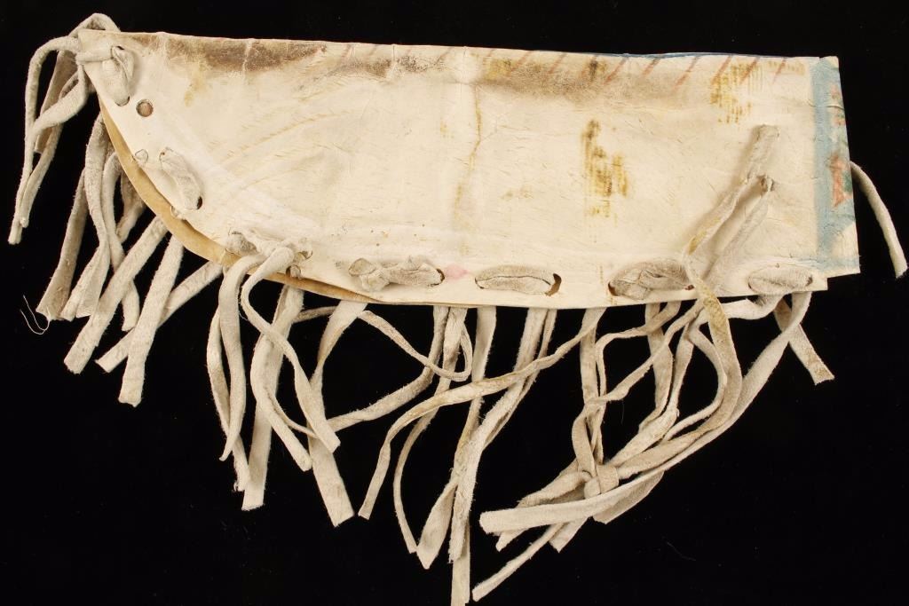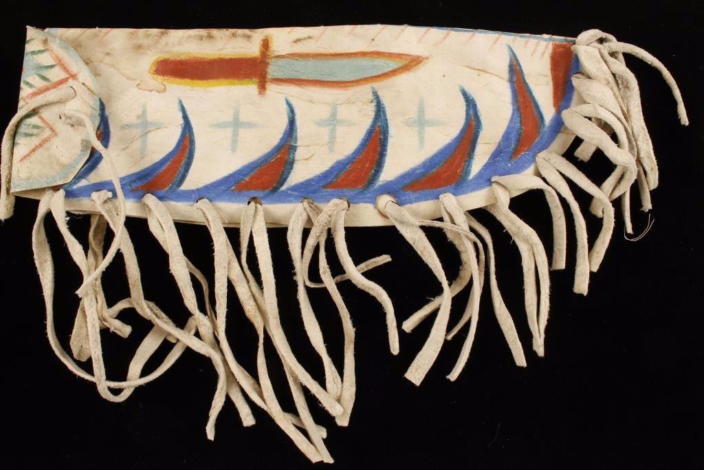Hand painted on hide. Measures 18"x5 3/4". Rex Stark Catalog of Americana listed at 1930-40. Probably an exhibition or display piece.
