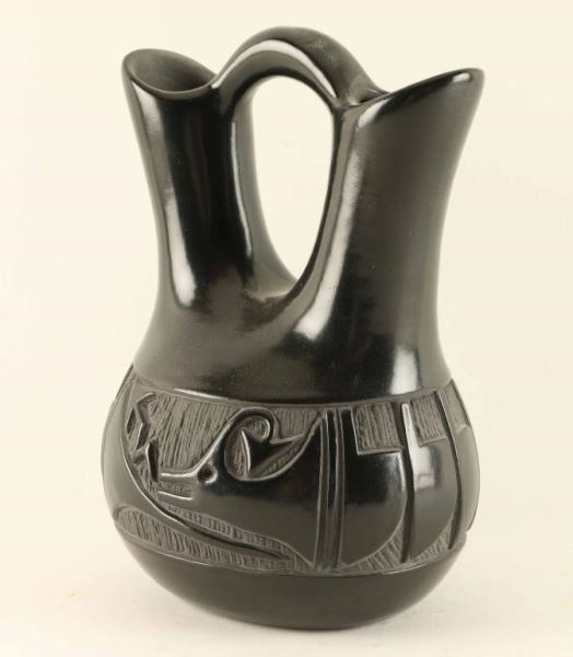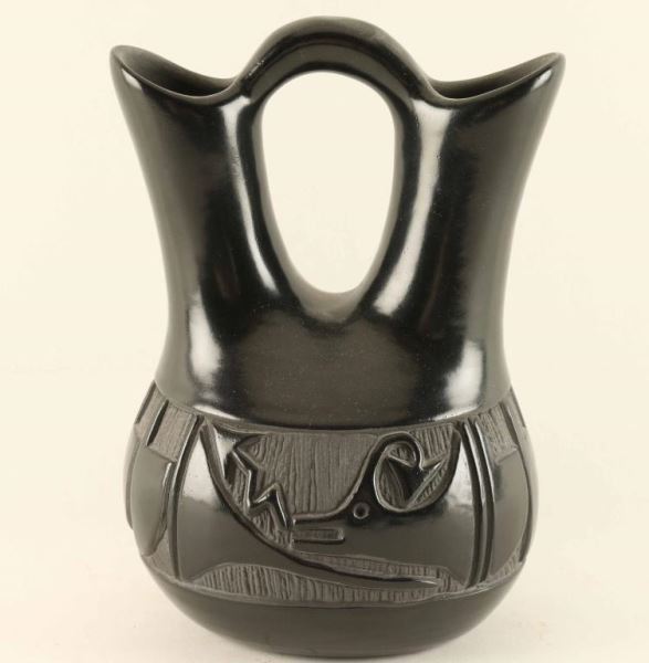 Animal and feather motif carved across center of vessel. Signed 'Kim Ticheni' on bottom. Good condition.