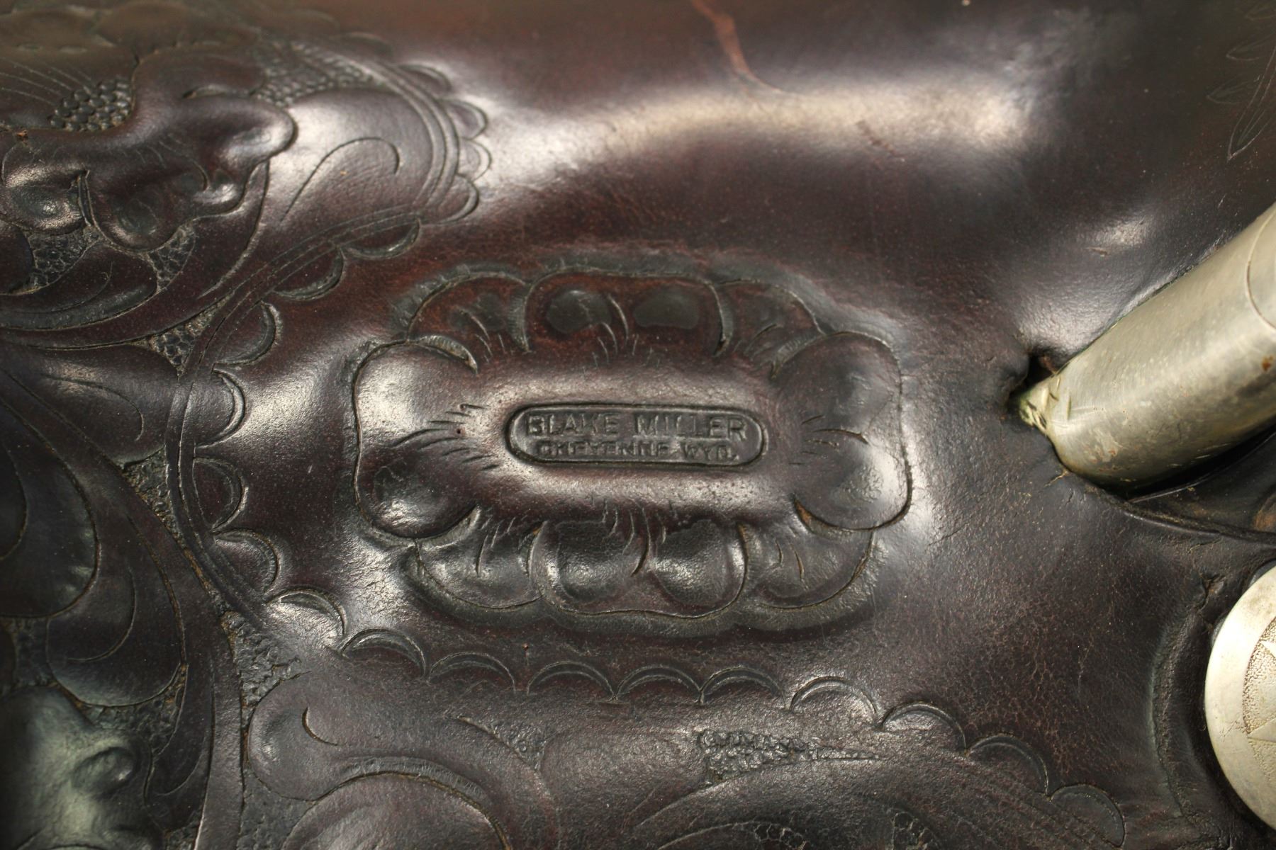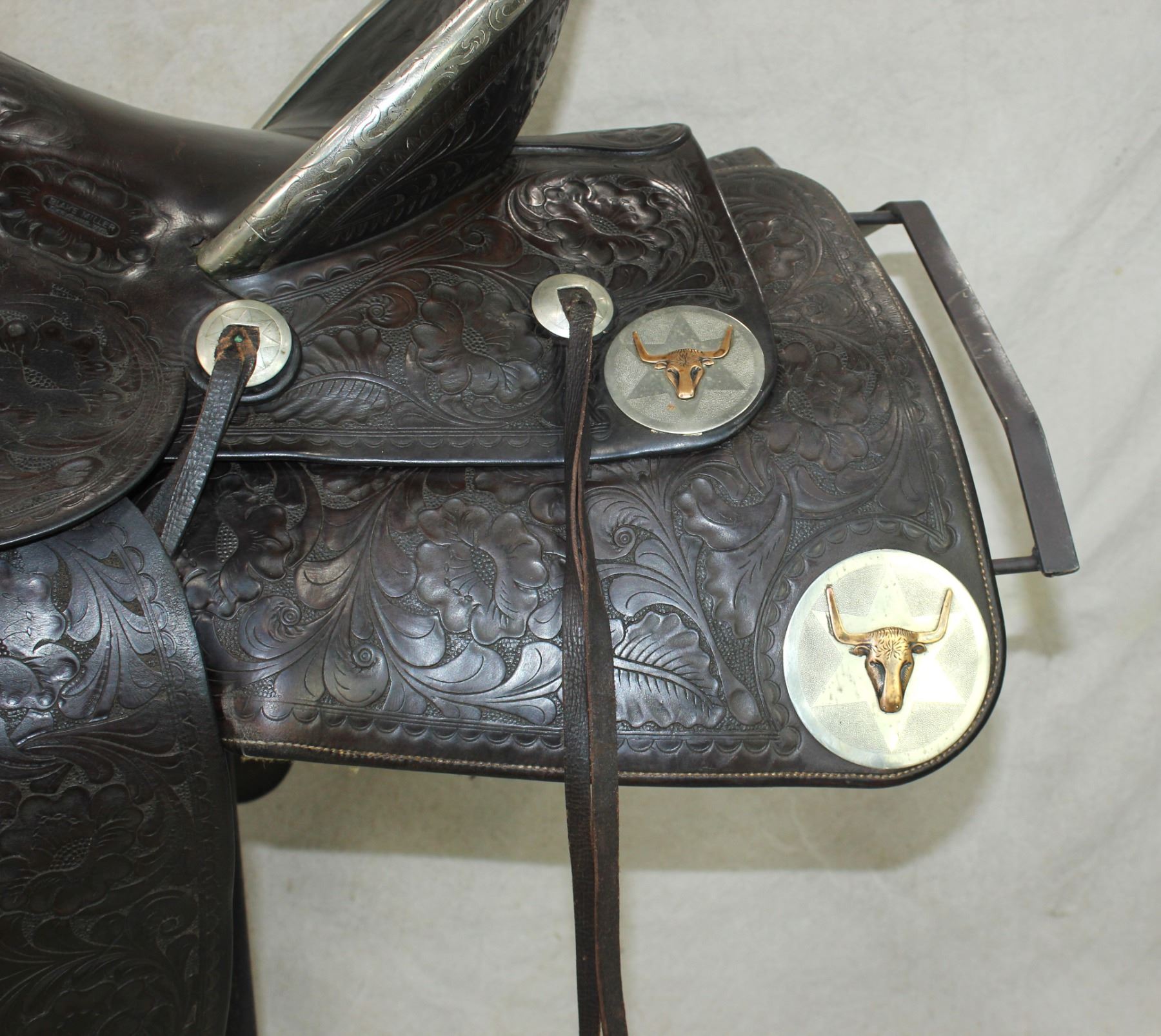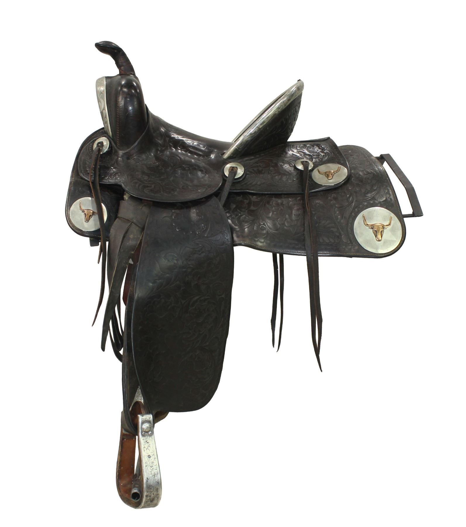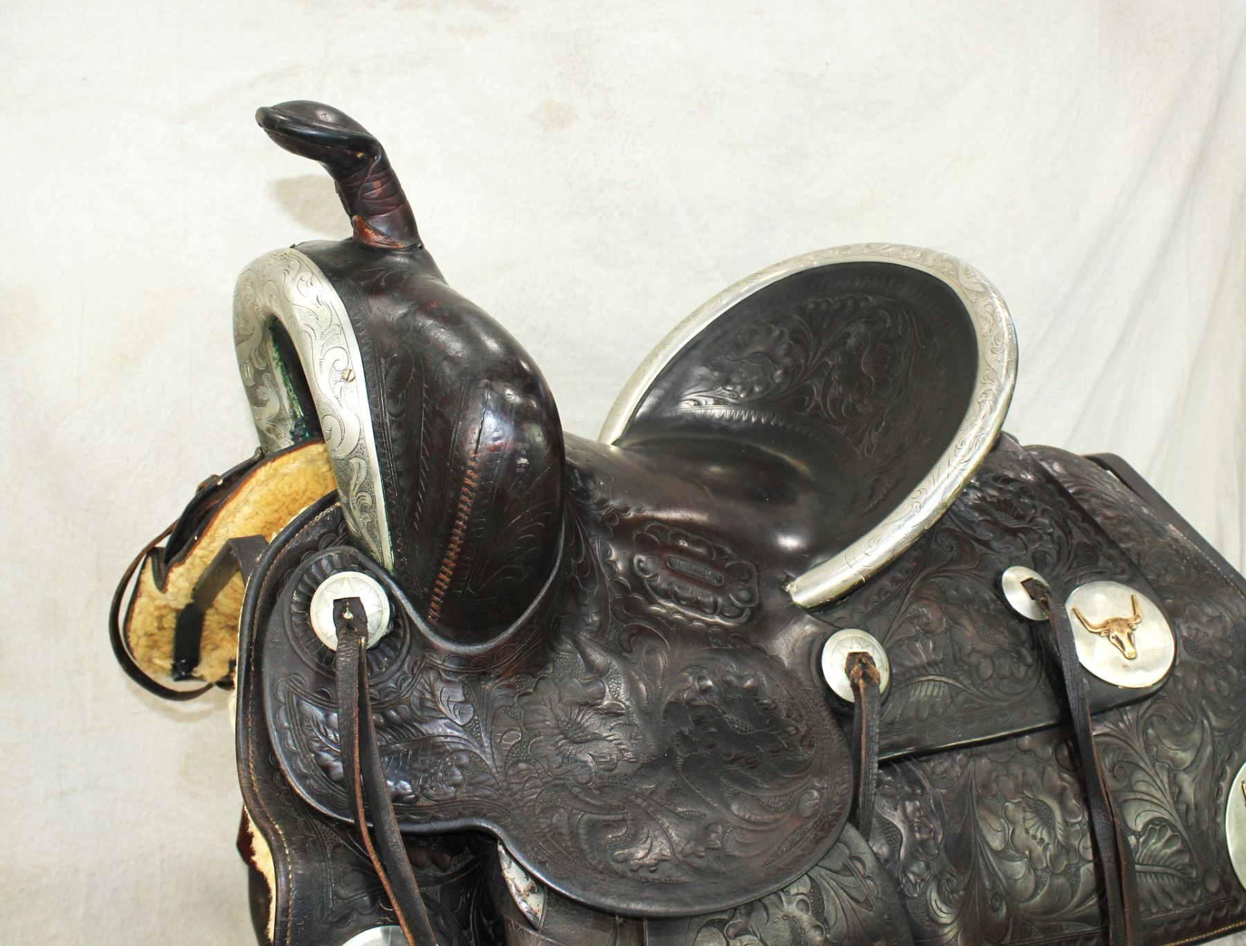 Outstanding Cheyenne Wyoming made saddle with a terrific profile, with large square skirts, a 14 1/2" seat, an extra tall 5 1/2" cantle , profusely fully flower tooled, and highlighted by a silver bound cantle, gullet, and stirrups, finished with large silver discs with copper steerheads. Showing exceptional condition and rich russet color.