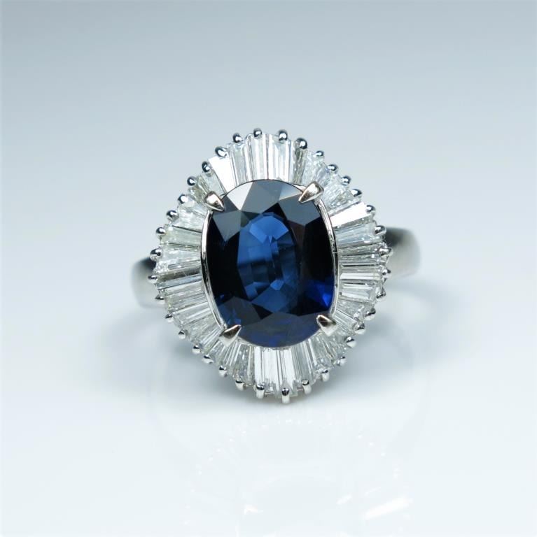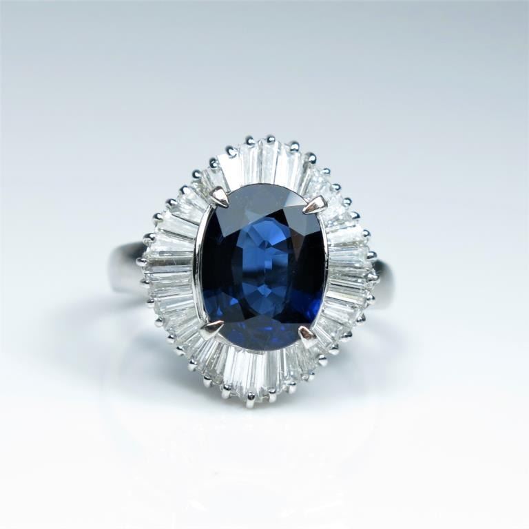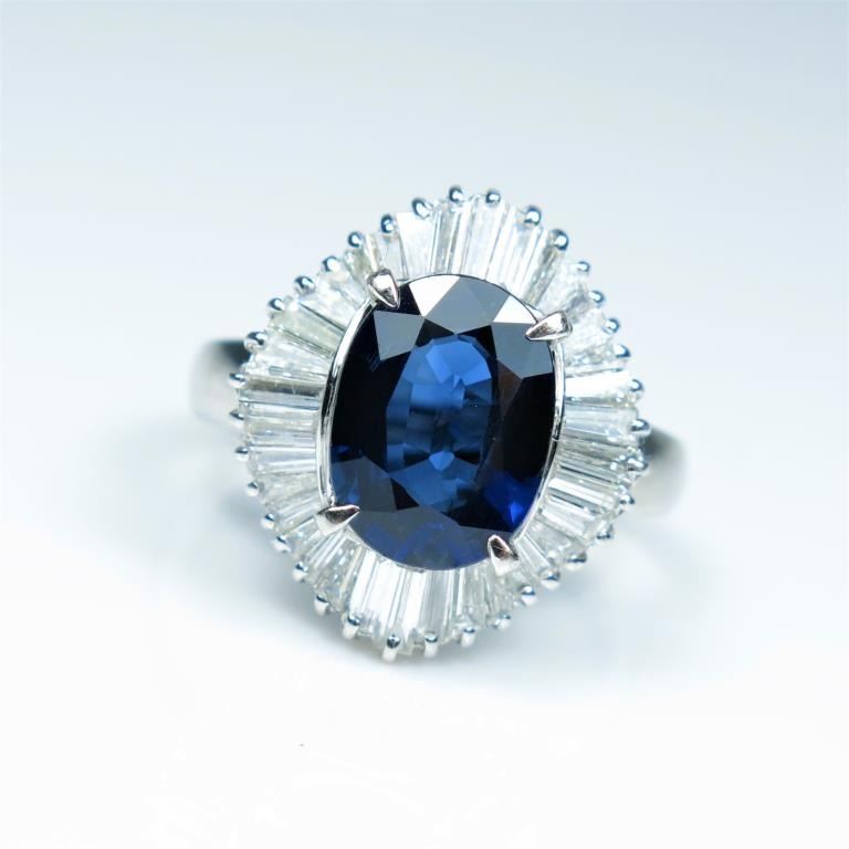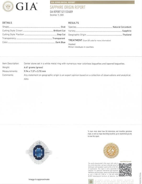 Exquisite ring featuring a G.I.A. certified Blue Sapphire weighing approx. 3.01 carats and surrounded by 40 Baguette cut Diamonds weighing approx. 1.20 carats with F-G colors and VS/SI clarity set in a fine 14 karat white gold ballerina design setting. Retail $8,000-$12,000