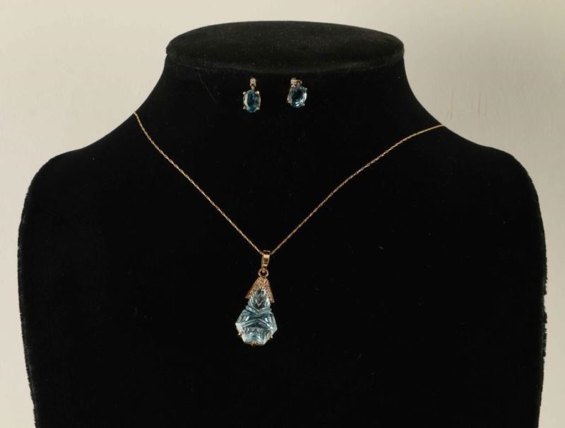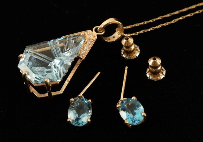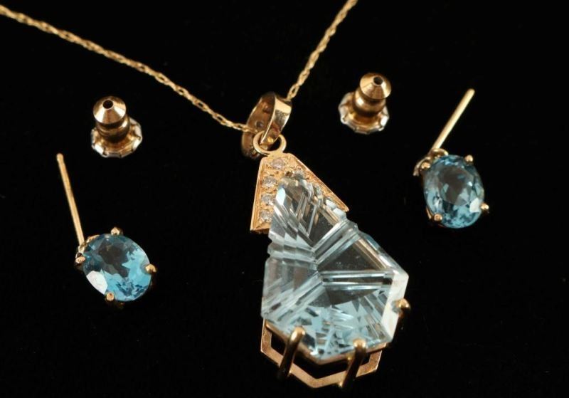 Set in 14K gold with a fantasy lazer cut blue topaz and diamond pendant containing seven 1.7mm diamonds with an approx. total weight of .14ct. Fashioned as a 14k pearl enhancer, clasp is set with two 1.3mm and one 1.7mm diamonds, approx total weight of .04ct. Topaz is Swiss blue kite shape laser cut measuring 20x15x7.75mm. Pendant hangs on a 20" box link chain with a lobster claw clasp. Earrings are also set in 14K gold and each diamond measures 1.6mm. Approx. total weight .05ct. Diamonds are set in 4 prong heads with screw back posts. Comes with appraisal.