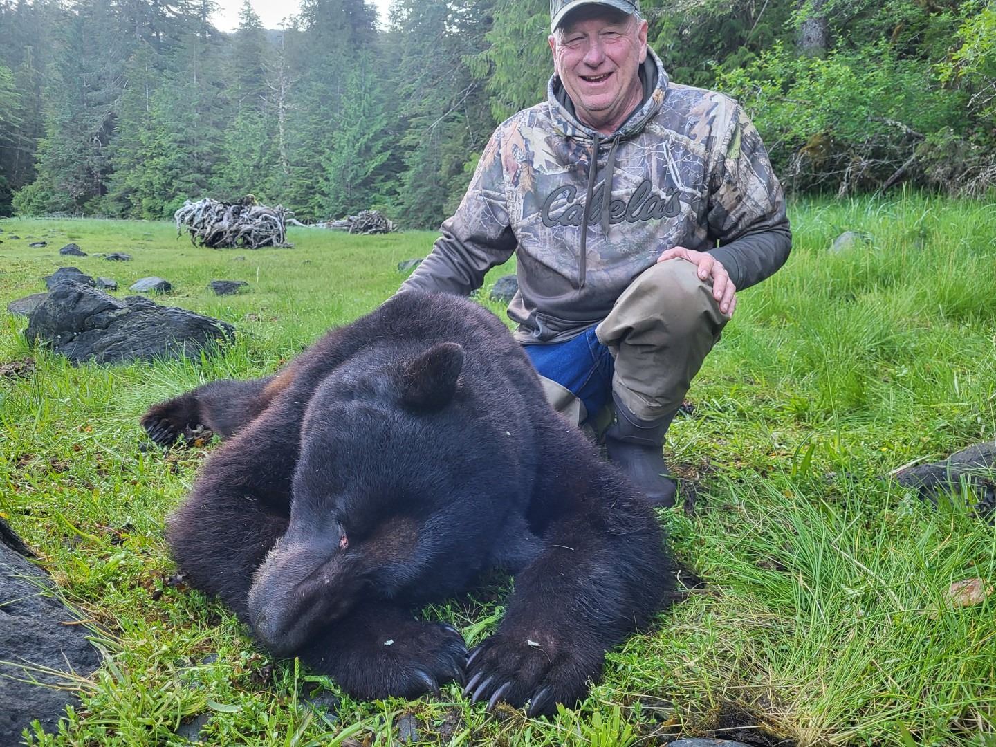 We start in Ketchikan, Ak which is where you would fly into and out of. We leave from there with the 70ft vessel wich we will be calling home for the duration on our 8 day hunt, the Grizzly Rose. Grizzly Rose is equipped with full queen staterooms that bost their own private bathrooms each with their own shower. The hunting begins between 3 and 4 pm every day and goes until dark which is between 11pm and midnight. The bears will be out feeding on the first green grass of the season which is where we will be focusing our efforts, glassing the tideflats with greenbelt that have signs of grazing. We also utilize game cameras to cover the known bear feeding areas so we aren't always wondering what's in the next spot. We have a 96% success rate mostly due to weather and passing bears looking for bigger and better. The nice thing about our hunts is that most bears we see are killable as long as the wind is acceptable. Our Black bears average 6'11 with our goal being 7 - 7 1/2ft and some bigger bears in the area but not the norm. Please let me know if you have any more questions or would like to jump on a phone call to discuss further! We can accommodate families no sweat!