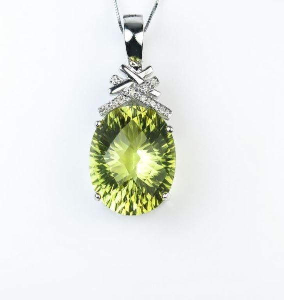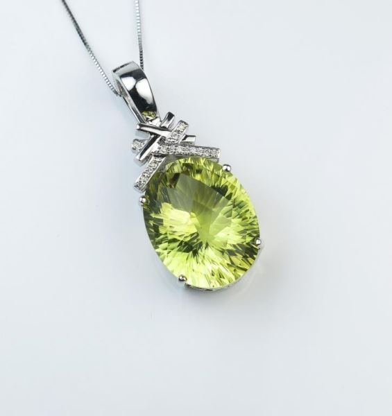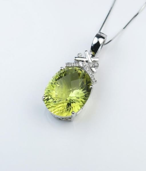 Weighing approx. 20 carats accented with 10 diamonds with F-G colors and V-S clarity set in 14 karat white gold designer style setting.