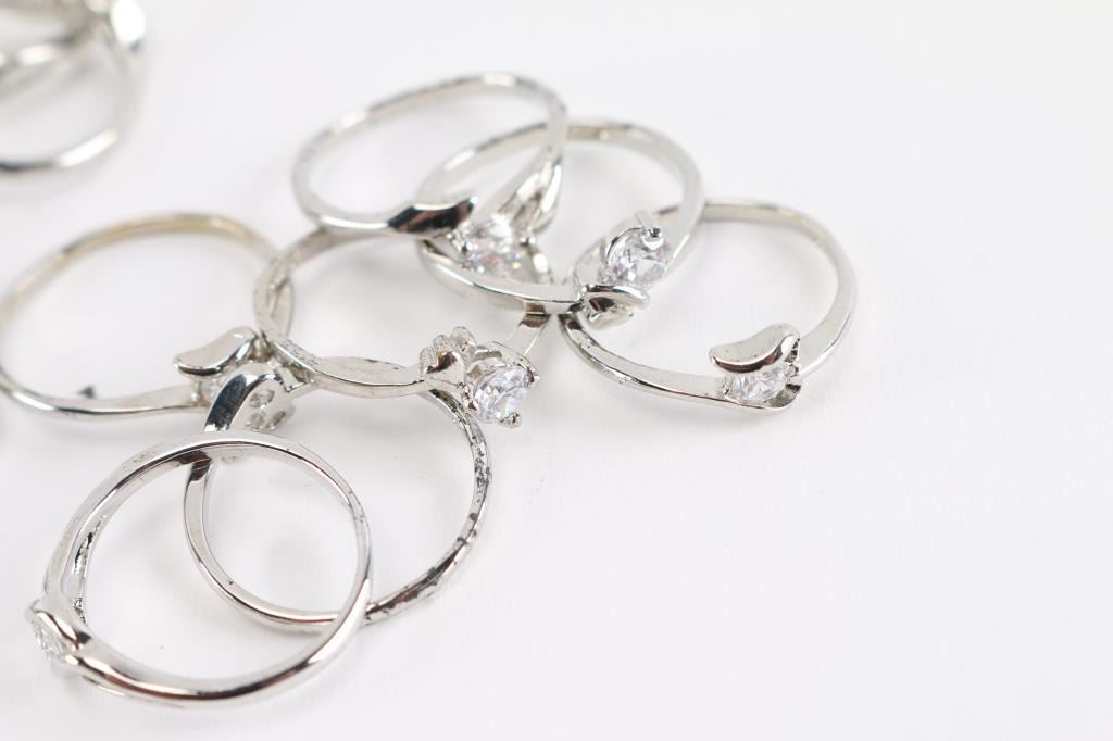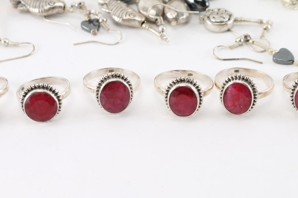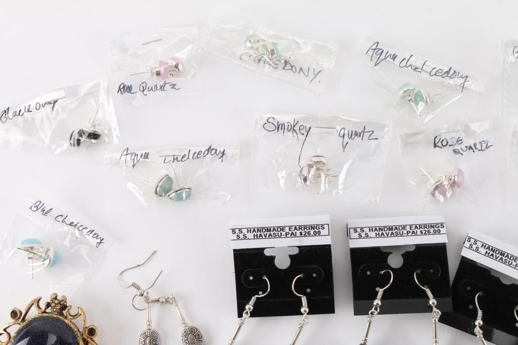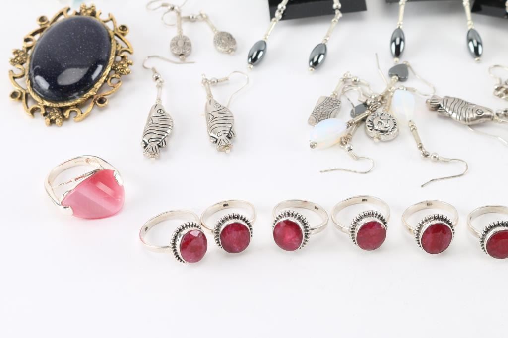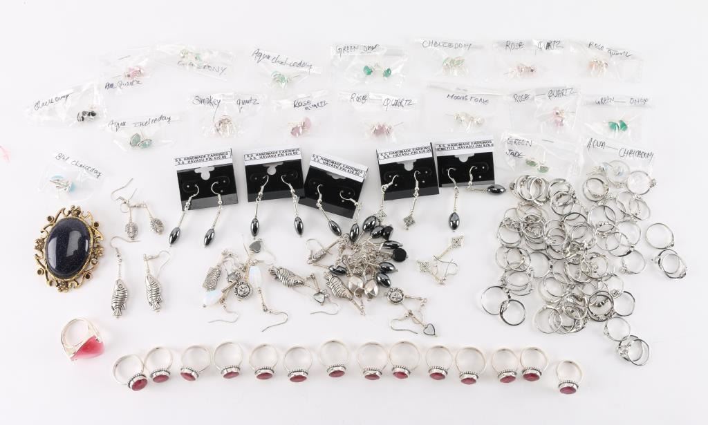 (74) Dainty silver colored rings with CZ stone, various designs and sizes.(20) Pair of fishhook dangle earrings, various designs.(18) Pair of stud earrings featuring moonstone, rose quartz, smoky quartz, chalcedony, aqua chalcedony, blue chalcedony, green onyx, black onyx, green jade.(14) Sterling silver rings with pink ruby moonstones, various sizes. (1) Pink cats eye in silver tone ring, size 9.(1) Pin in gold tone with sparkly blue center.