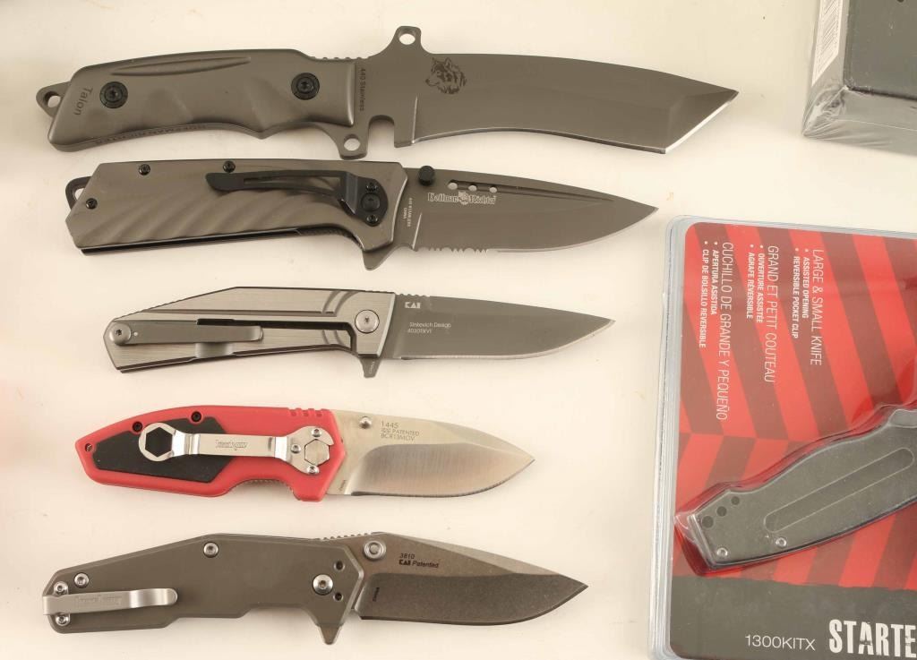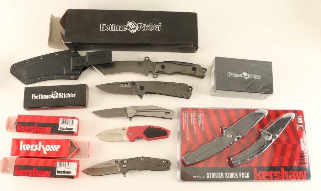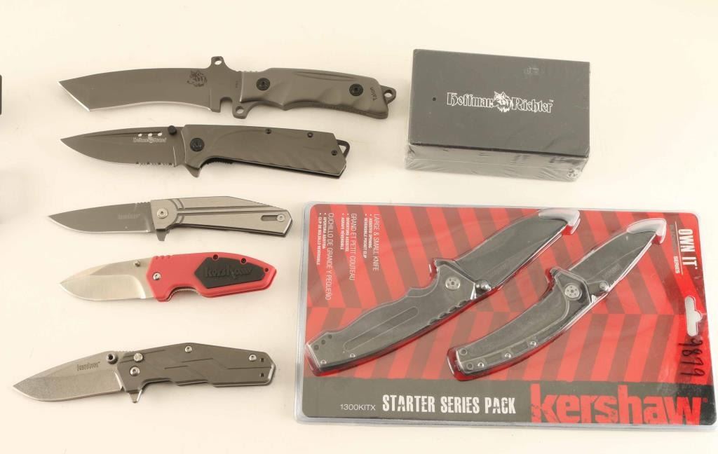 Seven total including five Kershaw folders in packaging. A Half-Ton, a Dimension, a Nura 3.0 and a 2 knife starter pack. Also includes two Hoffman Richter knives, and a multi-tool. See Photos