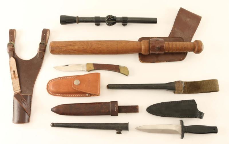 US Night stock in 1943 holder, Swedish bayo holder,3 bayo scabbards includes two Brit scabbards,Folding knife and boot dagger. Weaver 4X rifle scope.