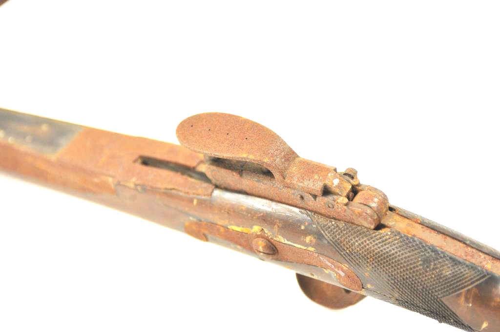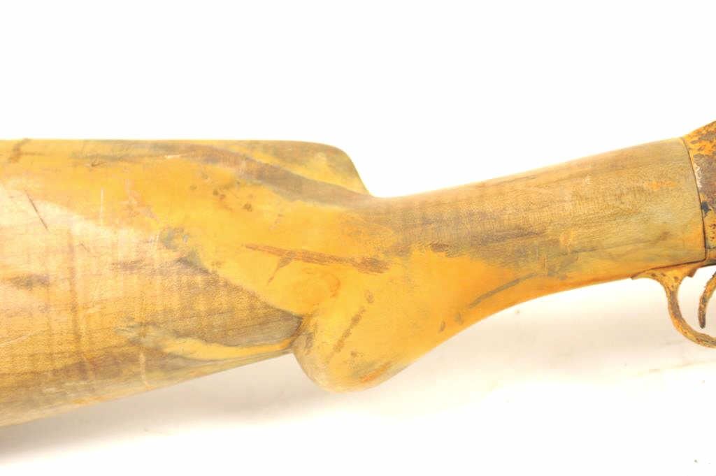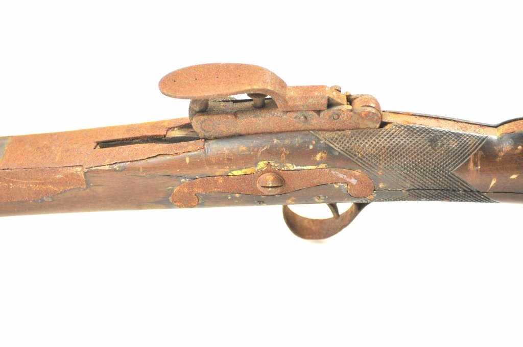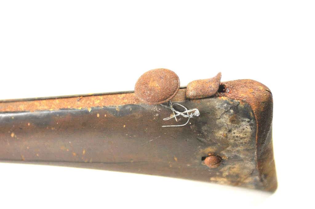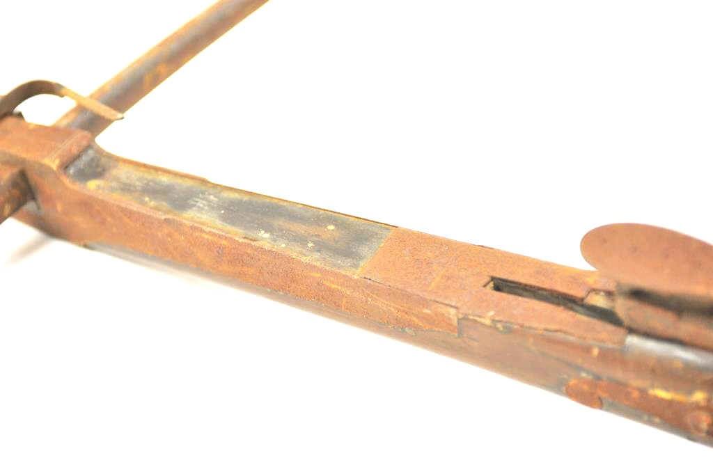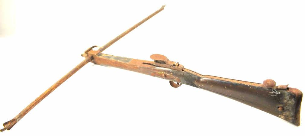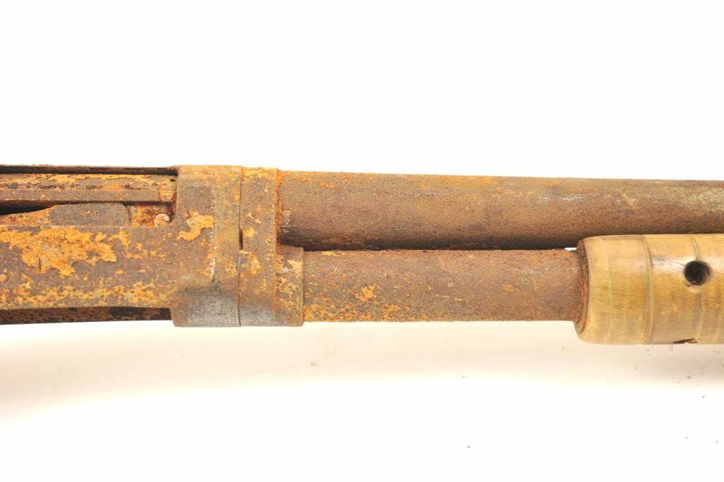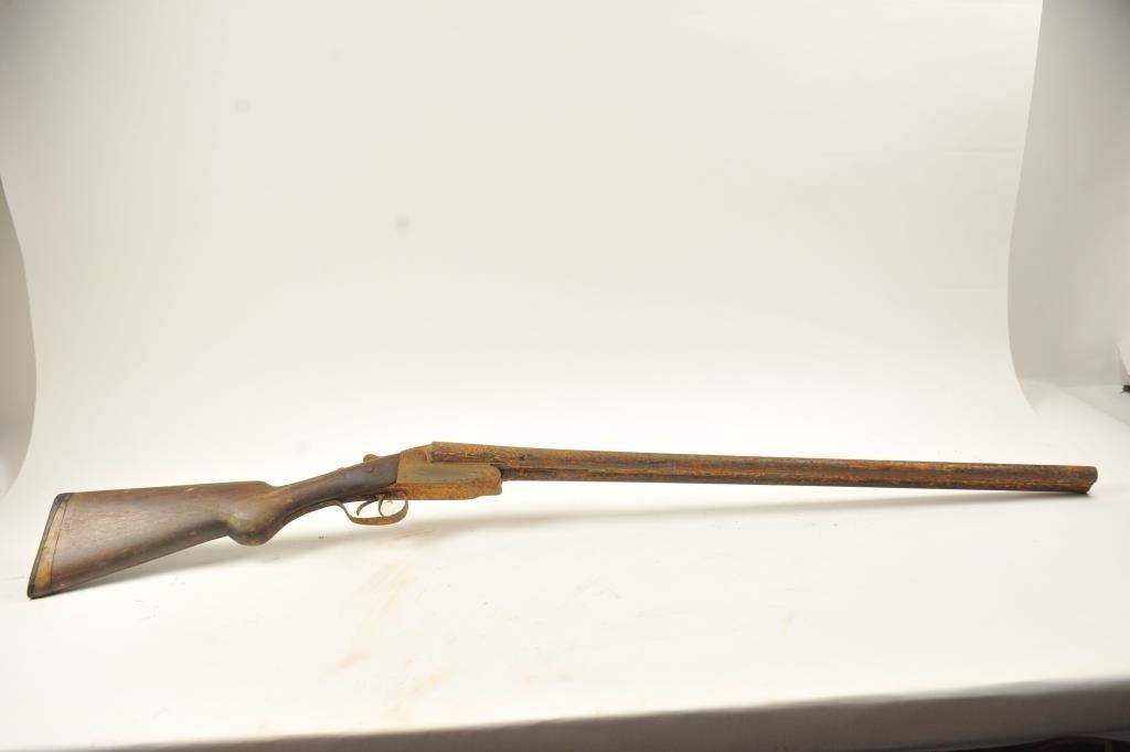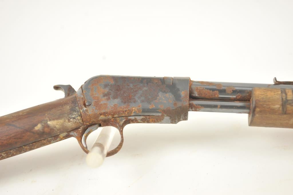 Bonanza lot of rusty relics including three rifles, two shotguns and a crossbow. The rifles include a Remington Rolling Block 7mm, Winchester Model 62 pump rifle, side by side shotgun, pump shotgun and a bolt action .22rifle. All six items are water damaged and rusted, needing restoration. They are sold as is, where is, with no warranty made or implied. Est.: $200-$400. (C+R).
