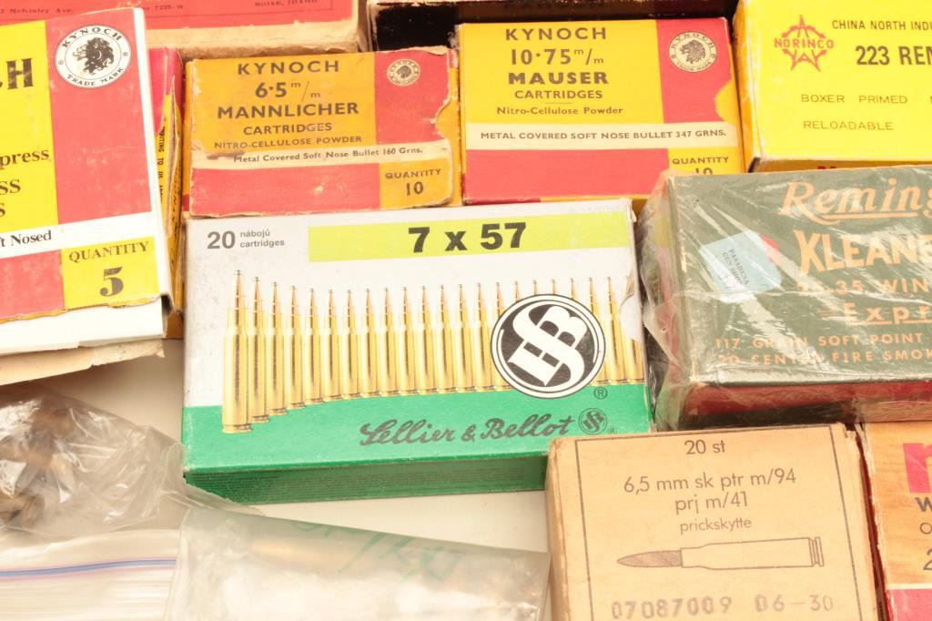 of Winchester .38-40 and two boxes of Remington .25-35 Winchester. Additionally, the lot includes a vintage box of .256 Newton, Kynoch and Norma 6.5 x 54 Mannlicher, 6.5 x 55 Swede, 7 x 57 Mauser and two old boxes of Norinco .223. A great collection of vintage ammo in a host of calibers. Est.: $150-$300.