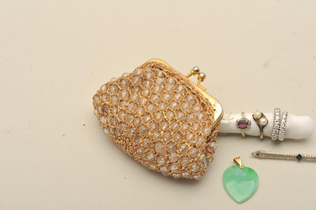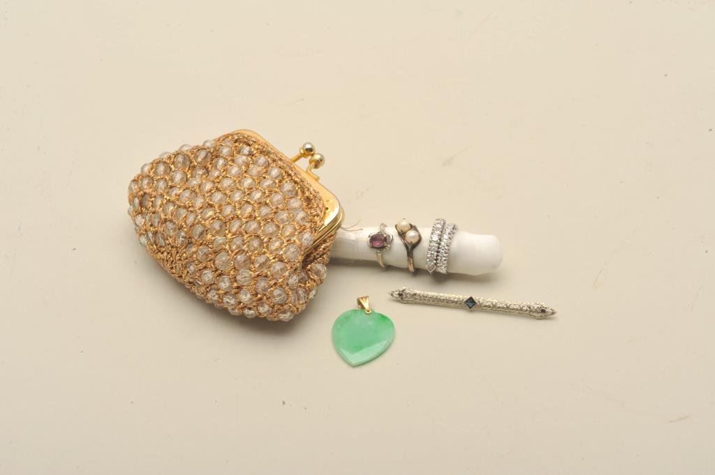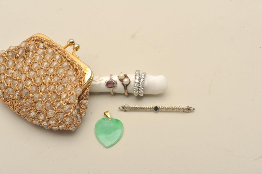 heart pendent, diamond band in 14 white gold (1/2 CT plus total). Diamond band in platinum with 7 stones 8-10 pts each and 2 antique silver rings. Estate consigned. Est.: $125-250