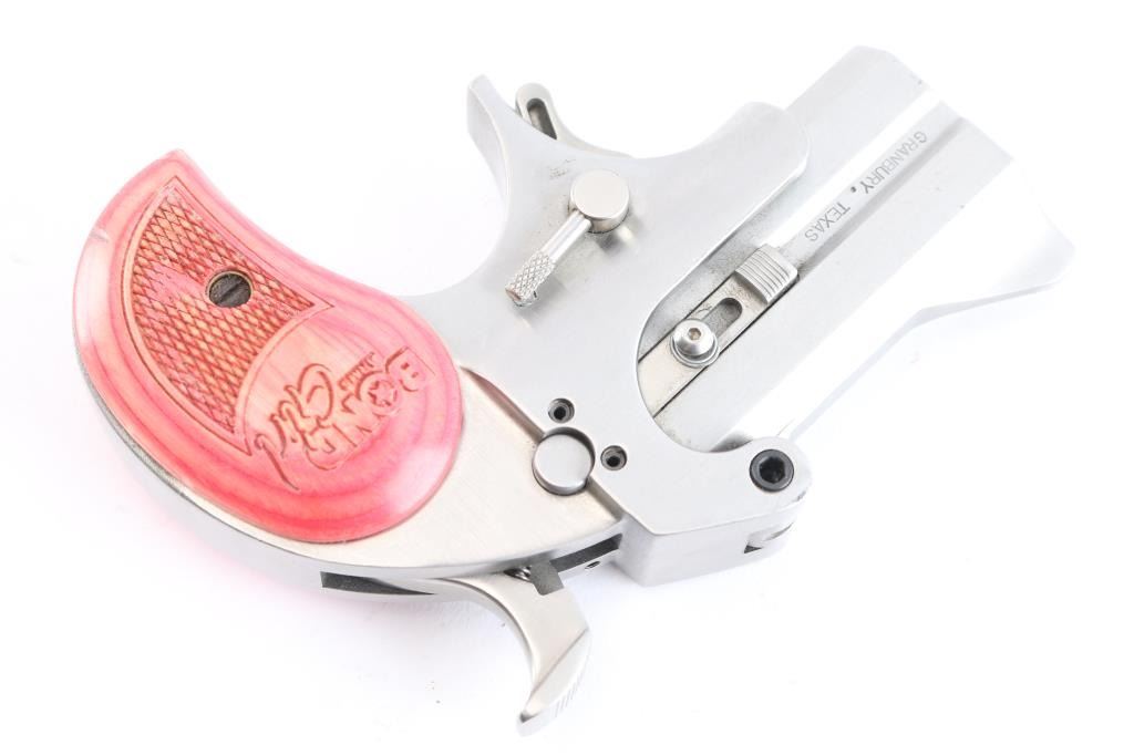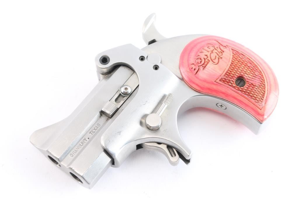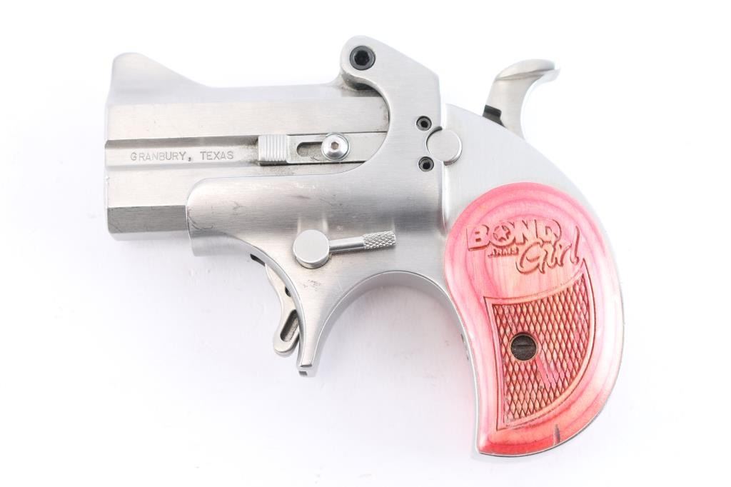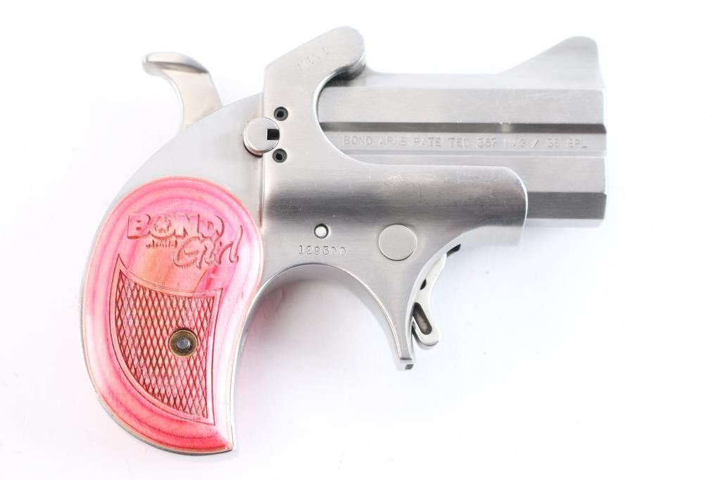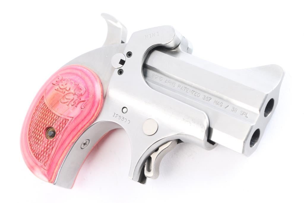 Made in America from Bond Arms in Texas. Over under derringer chambered for .357 Magnum and .38 Special ammunition. Stainless steel construction with satin finish. The Bond Girl Mini is a special edition featuring a 2.5" stainless tip up barrels in a stainless grip frame. Smooth spur trigger, integral sights and a serrated hammer spur. Two piece pink accented wood grips with laser checkering and "Bond Arms Girl" laser engraved on both panels. Bores are excellent/bright. Pistol shows tiny scratches and dings throughout. Condition is NRA very good. ***Modern Firearm***