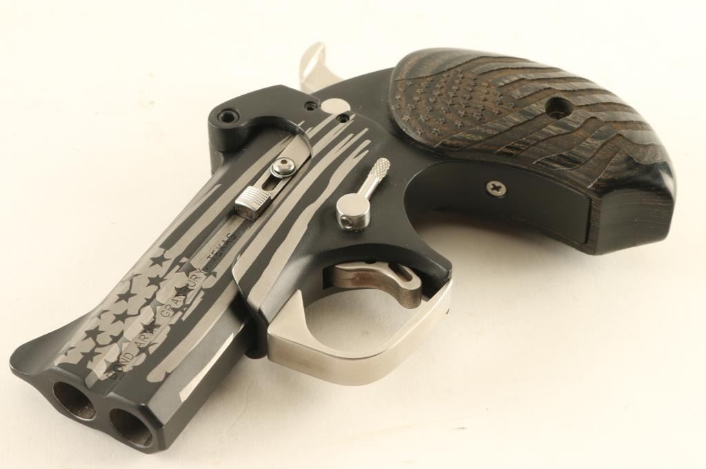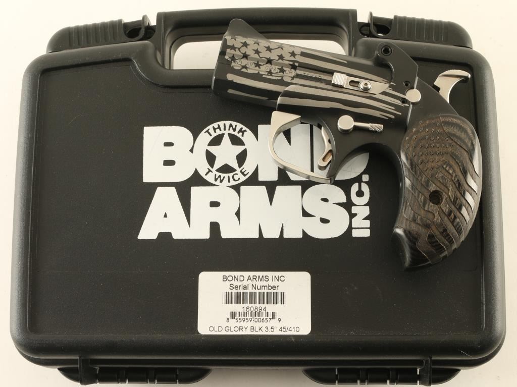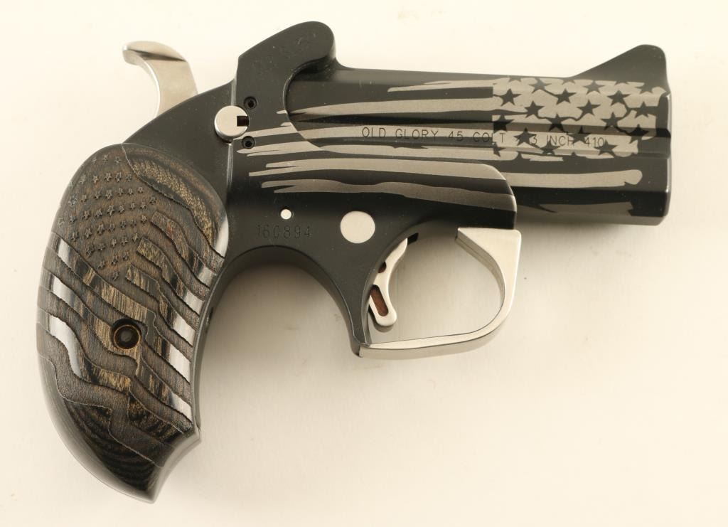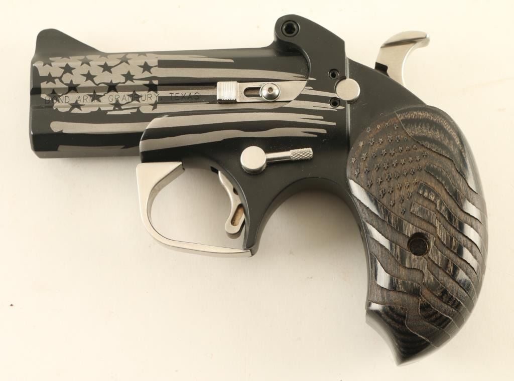 Over & Under double barrel derringer chambered for 45 Colt or 410 bore 3" shells. Features single action operation, manual safety, manual extraction, approx 3-3/8" barrels. Metal is finished in a matte black with silver colored American flag motif on both sides, and bright stainless trigger, hammer, barrel latch, trigger guard. Grips are black colored laminated wood with a stylized American flag engraved on both sides. Bores are in excellent condition, appear dirty from firing, need cleaning. Overall condition is like new, with few observed signs of use. Includes manual and Bond Arms hard plastic, foam lined carry case. Condition is NRA Excellent - Like New ***Modern Firearm***