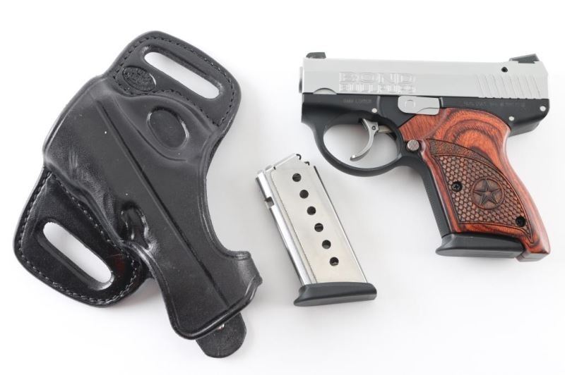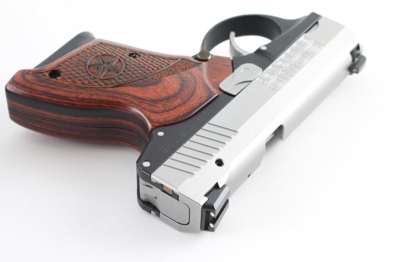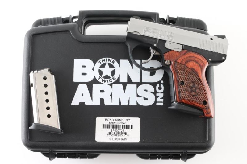 'Bullpup' style semiautomatic pistol chambering the 9x19mm cartridge. Features a very uncommon operation where the cartridges feed backward from the magazine, allowing for a shorter than normal slide length of 5 inches with a 3.25 inch barrel. The three dot sights are in dovetails, allowing for windage adjustments. Trigger is "double action only" type, with restrike capability. Bore is excellent. Matte stainless slide and matte black frame are excellent with few signs of handling. Checkered wood grips bearing the Bond Arms star are excellent. Includes factory black plastic foam lined box, paperwork, spare black plastic grips, black leather belt slide holster, (2) magazines. Condition is NRA Excellent - like new *** Modern Firearm ***