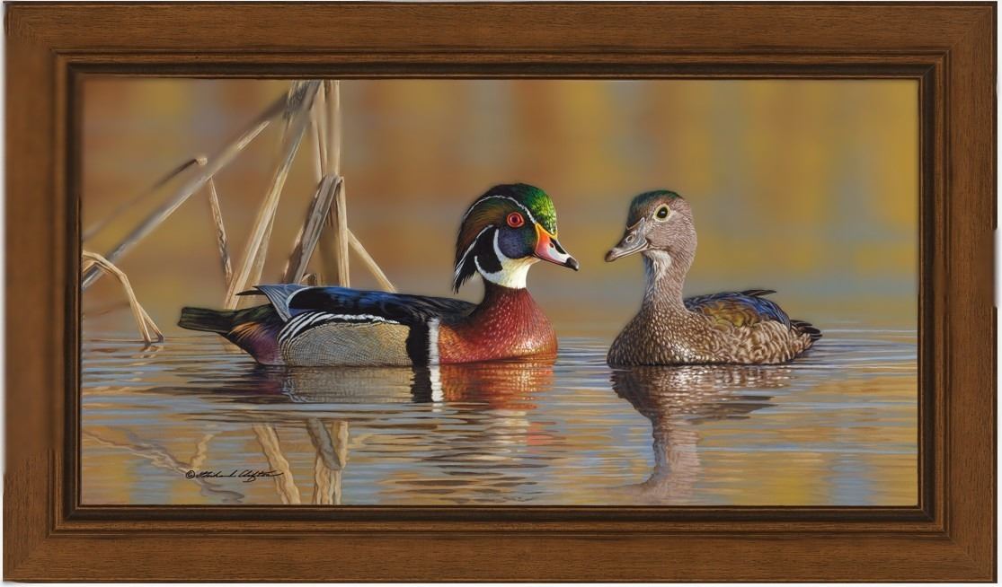 Renowned wildlife artist Richard Clifton captures a serene moment in nature with his piece featuring a pair of wood ducks gliding across a calm, reflective body of water. The male’s striking plumage contrasts beautifully with the subtle elegance of the female, all rendered with Clifton’s signature clarity and warmth. Known as one of the nation’s most accomplished waterfowl artists and a frequent duck stamp competition winner, Clifton brings both expertise and reverence to every brushstroke. This 13.75” x 26.5” canvas marks his 27th image featured in the Ducks Unlimited catalog—a true testament to his enduring legacy in conservation art.