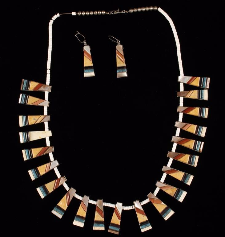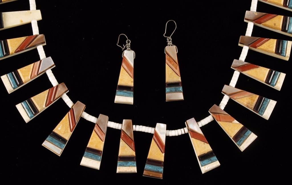 Inlaid with abalone, turquoise, onyx and other stones, done in a squash blossom style.