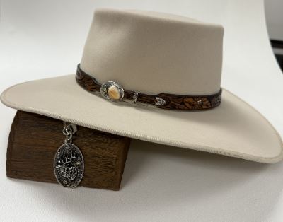 Discover an extraordinary fusion of nature, elegance, and craftsmanship with The Elk Ivory Collection, an exclusive collaboration between Rand’s Custom Hatters and Silver King Silversmiths, created for the woman who values artistry as much as beauty. At its centerpiece is a 100X Pure Beaver Fur Felt Hat in natural Bone — free of powders or artificial dyes — offering exceptional durability in rain or snow. A 2” perforated sheepskin sweatband ensures comfort, while traditional 1800s Conformateur sizing provides a precise, custom fit. The featured Pinched Telescope style is finished with a hand-tooled three-tone leather hatband showcasing a bezel-set Elk Ivory in a Sterling Silver buckle, accented with subtle 14K yellow gold Sunberry details and antique hand-engraved finishing. Complementing the hat is a coordinating Elk Ivory necklace with 14K gold accents, suspended from a solid sterling paperclip chain. Fully customizable and handcrafted in the USA, every element reflects heritage craftsmanship and refined design. Timeless. Distinctive. Exclusively yours. For more information, please contact Rand's Custom Hatters by phone at 800-346-9815. Company's website: www.randhats.com & www.silverkingusa.com