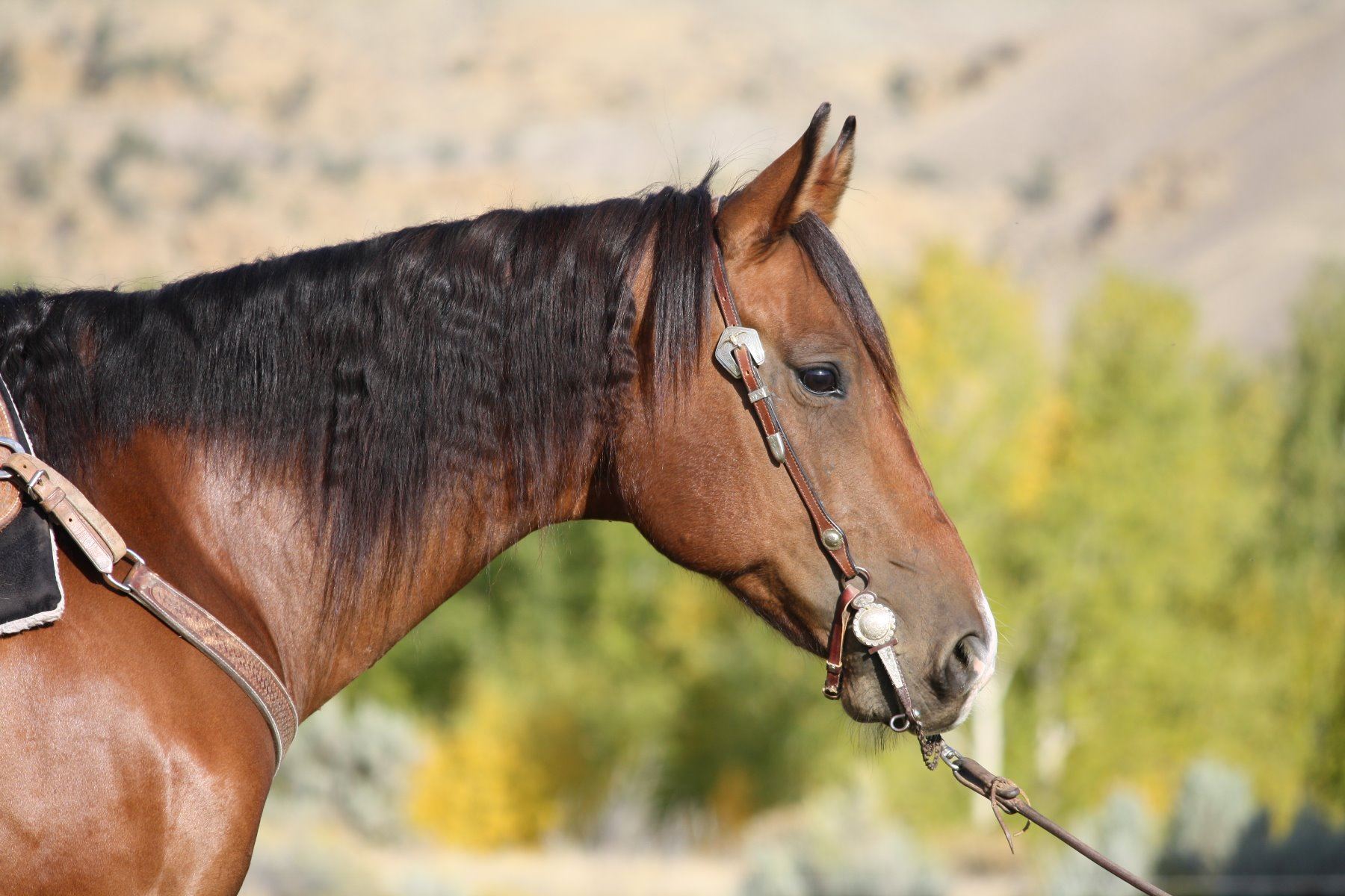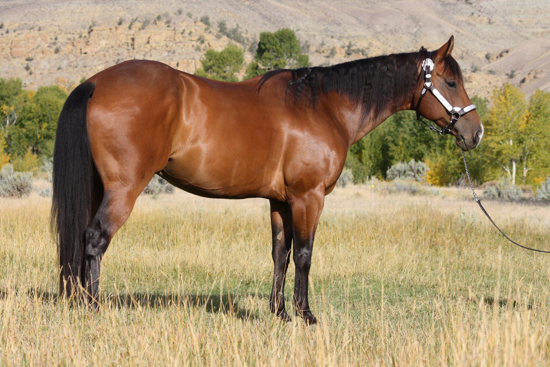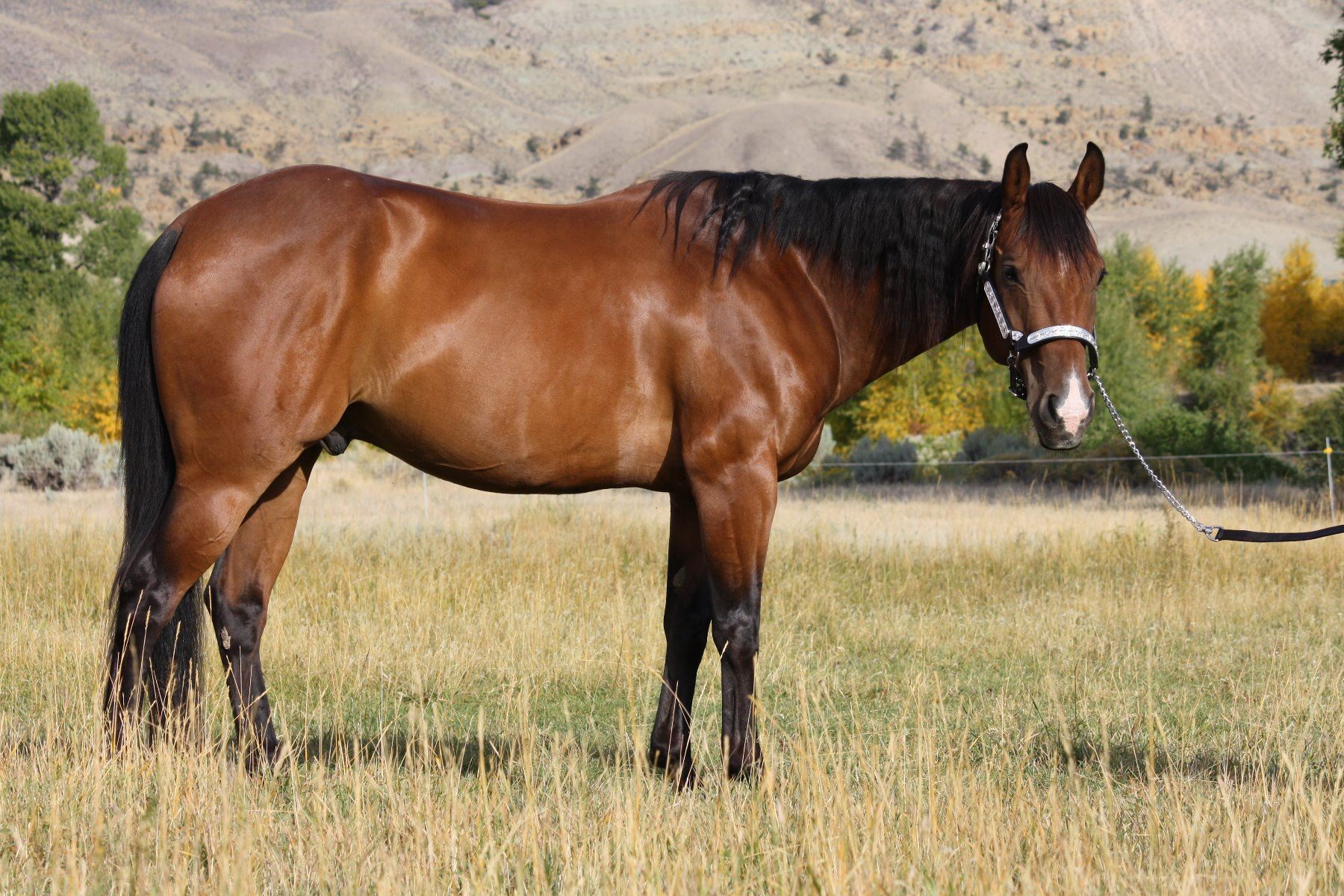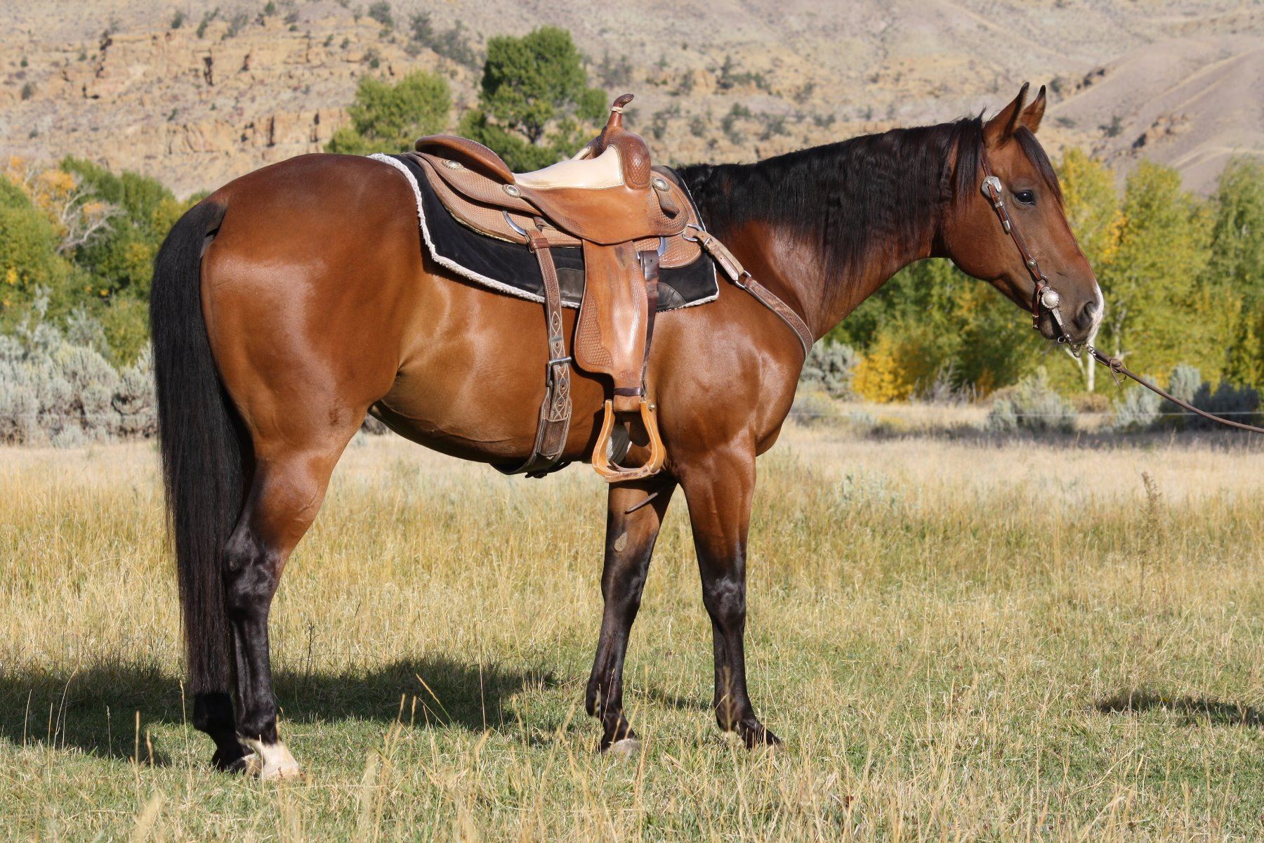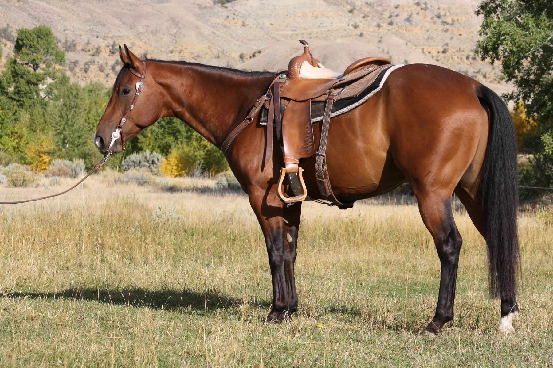 George is a gorgeous 10 year old bay gelding. He is very gentle and quiet and saddles up the same every time. We have owned George for almost a year and have used him for almost every phase of ranch work you can think of. He is our go to horse for our horse training barn needs. We have used him to move cattle, start and flag colts, pony weanlings and yearlings, turn back for cutting training, trail ride, crosses water and downed timber , put him through our trail obstacle course, drag logs, ect. George is also a pretty athletic horse, he lopes good circles, stops very well, picks up his leads, moves off leg pressure, open gates, ect. He has a very laid back disposition, very easy to catch, saddle, shoe, load, clip, worm, and vaccinate. However, probably not a first time riders horse unless in a dude string line. He has never offered to buck as long as we have owned him nor taken a lame step. He's just a gentleman guy around anybody and any other horse. We cant say enough about this very nice gelding.