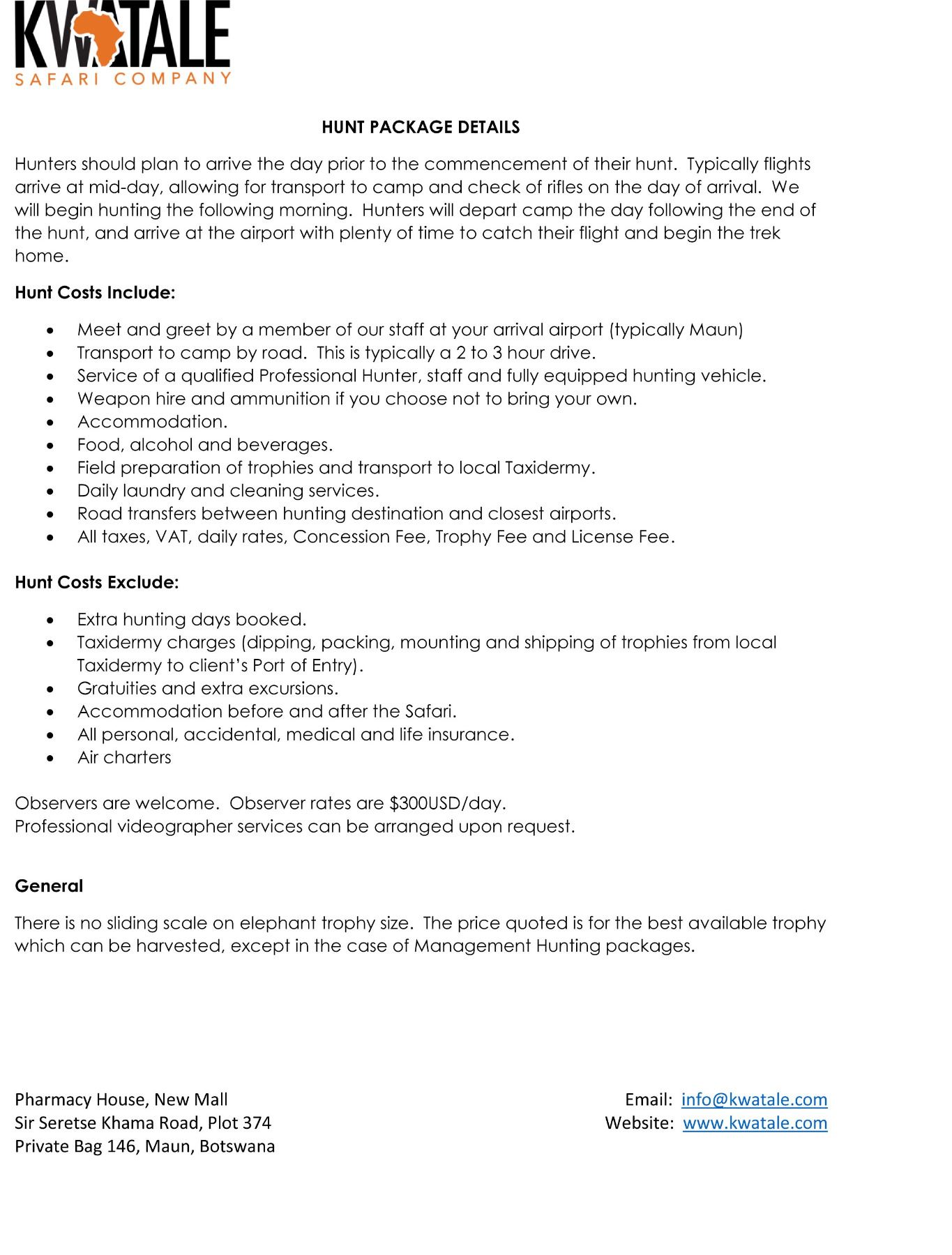 Items not included in the donation are any extra hunting days, taxidermy, dipping and shipping of trophies, and gratuities. Observers are welcome, and the rates are $300 US/day/observer.
