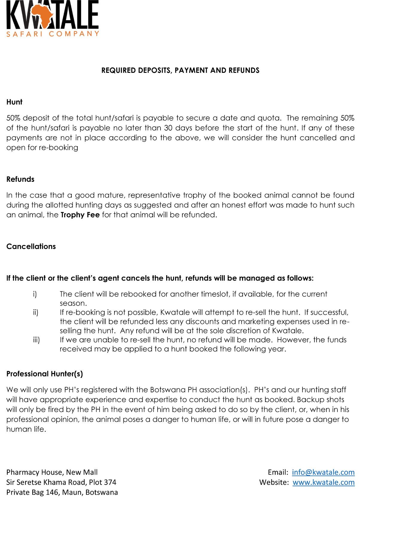 Please join us in thanking Bill Boycott and Kwatale Safaris for this 14-day hunt to take place within the NG43 concession in Botswana (in the vicinity of Moremi Game Reserve and Chobe National Park), a great African hunting area. You will be met when you arrive and depart from the regional airport at Maun, which has regular flights from Johannesburg and is 2 - 3 hours to the lodge.